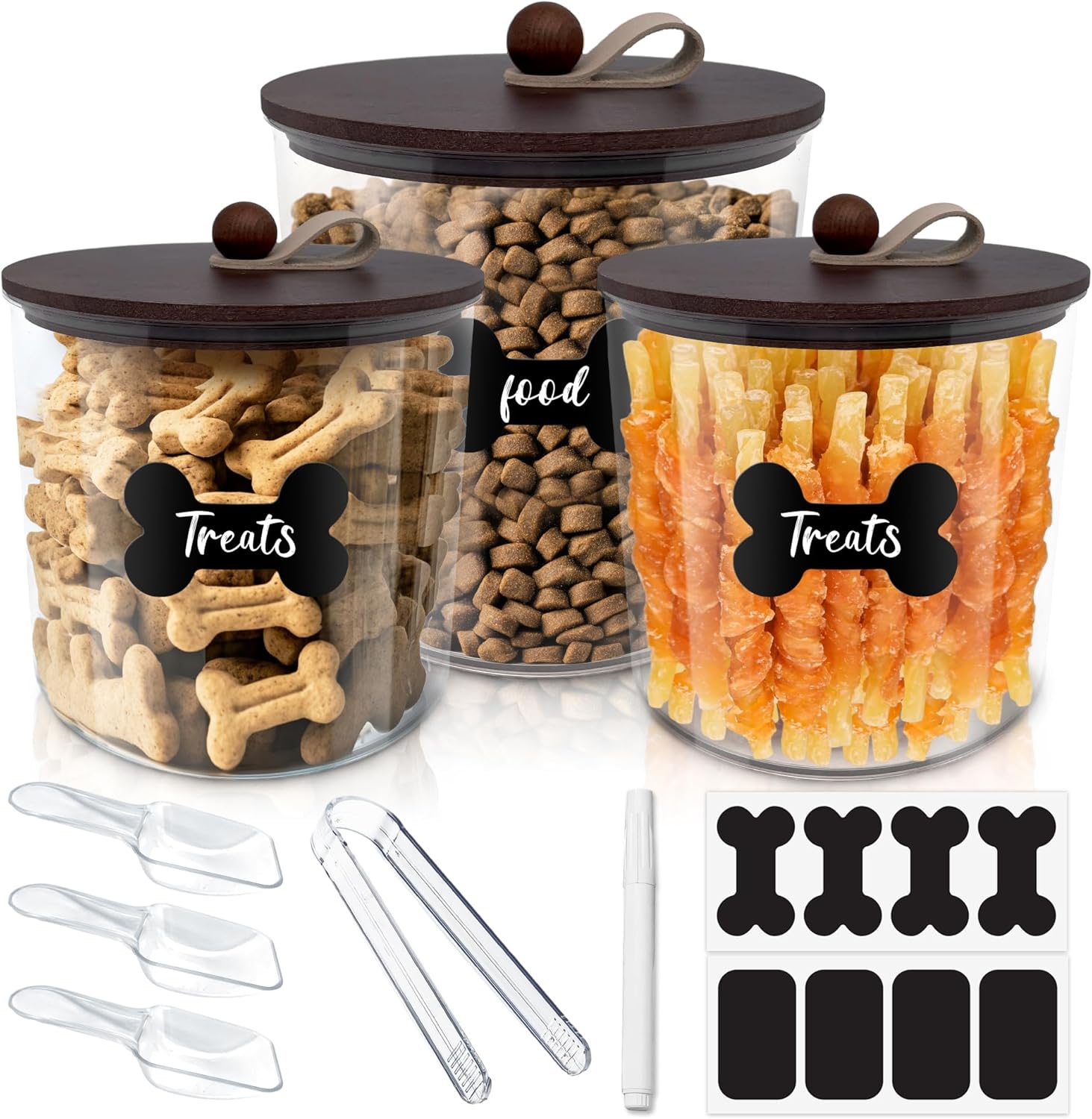 3 Pack Airtight Dog Food Storage Container, Dog Treat Container Dog Food Container with Wood Lids 8x7''&6x5'',Pet Food Storage Container,Cat Food Containers with Scoops,Clamp,Labels,Pens
