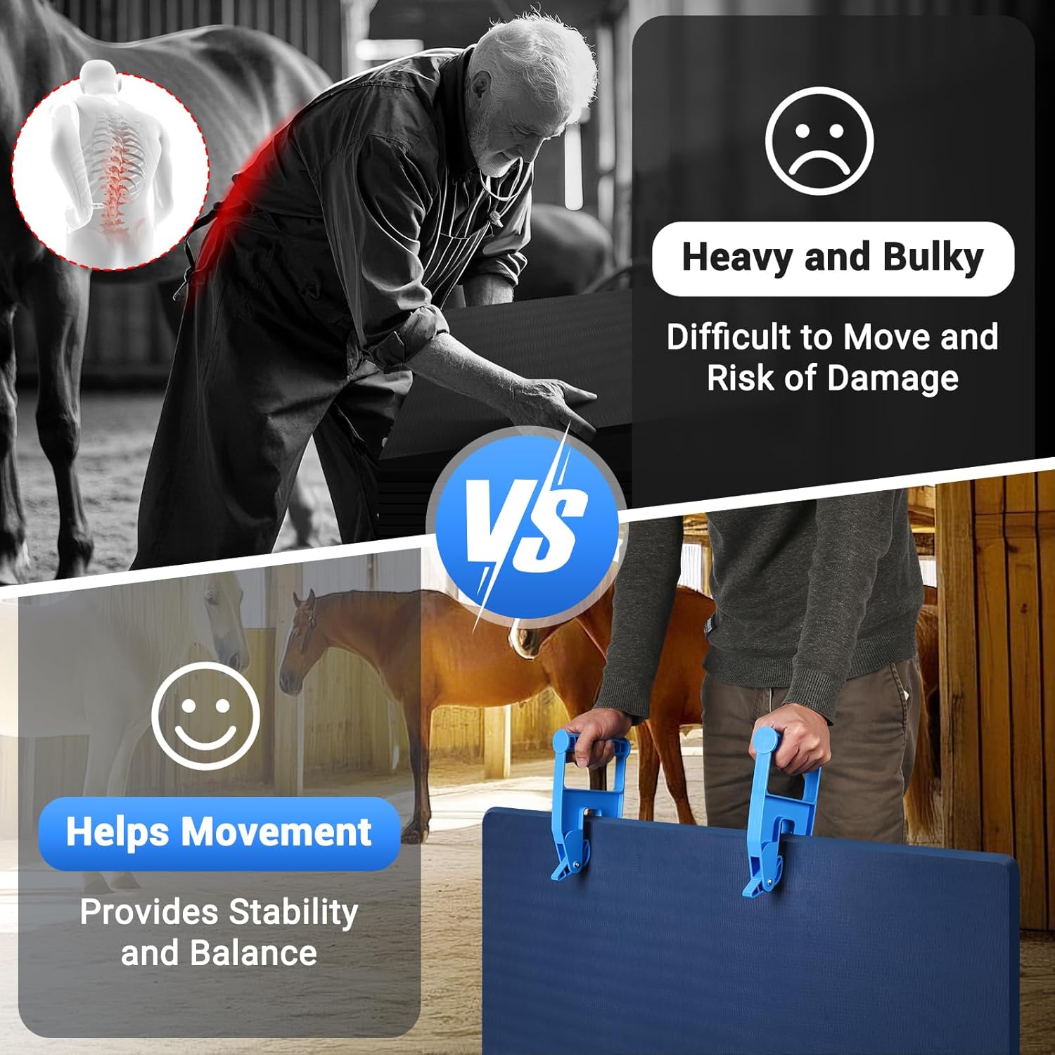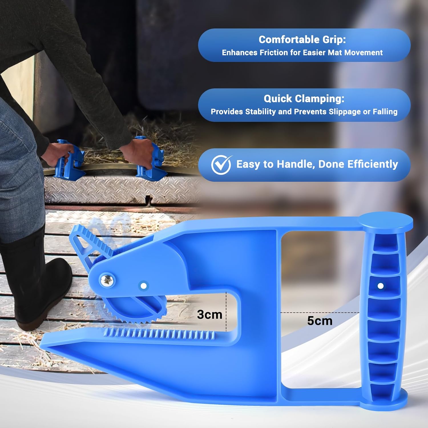 - [Multi-Scenario Use]You might need to move heavy mats like those at a barn, horse stall, trailer, or gym flooring. Specially designed clamps make it easier to handle these horse stall mats, helping you grab, move, or flip them for effective cleaning of debris and waste, boosting efficiency and safety.