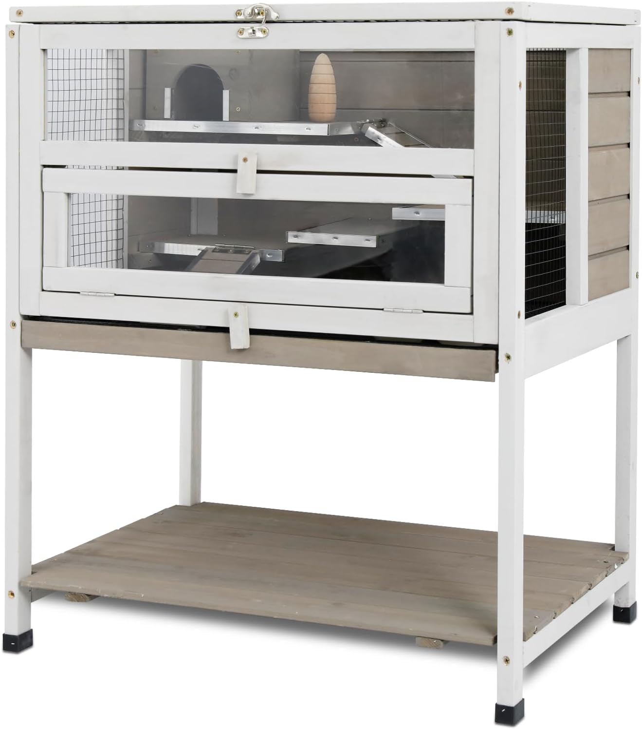 - 2-Story Guinea Pig House with Storage Legs: The first level with play area, allow pet to roam and enjoy itself freely. The second level,integrated storage shelf and stand structure,no need to place the cage on the floor or table,and enough space to put pet's essentials and food, ensuring both convenience and practicality.