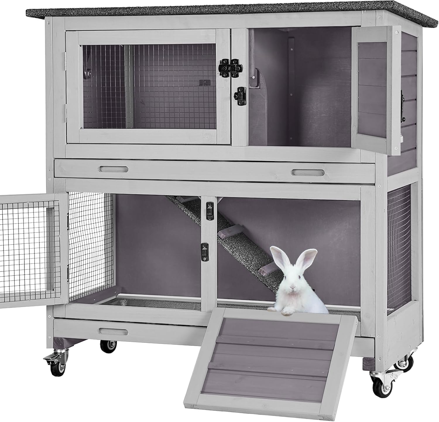 Rabbit Hutch Indoor Outdoor, Bunny Cage with Casters, Guinea Pig Cage Bunny Hutch with Two Plastic Trays 36inch