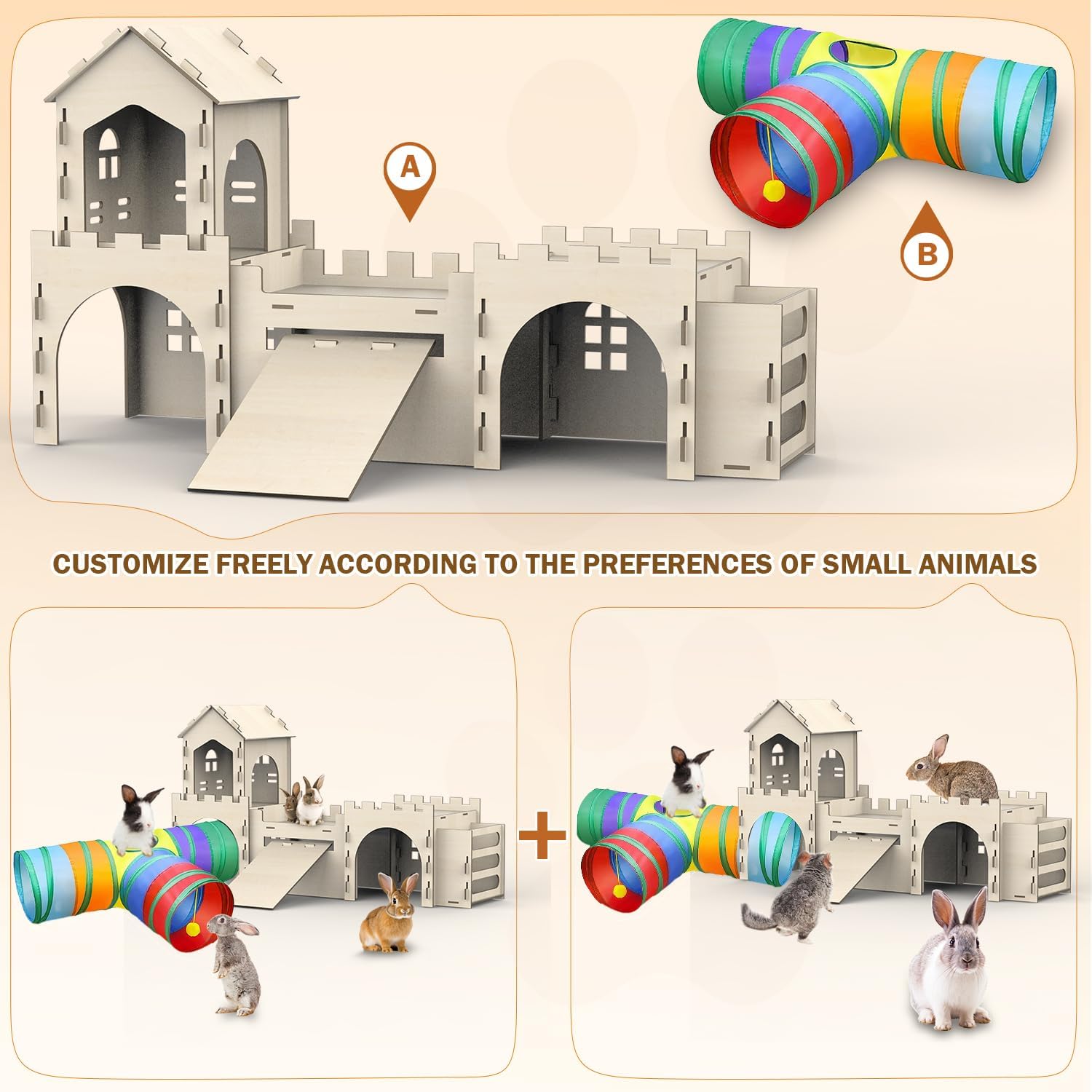 - Versatile Rabbit Hideout for Indoor and Outdoor Use:Whether indoors or outdoors, our rabbit houses and hideouts are versatile enough to suit any environment. The detachable bunny tunnel and easy-to-clean design make it a practical choice for all bunny owners.