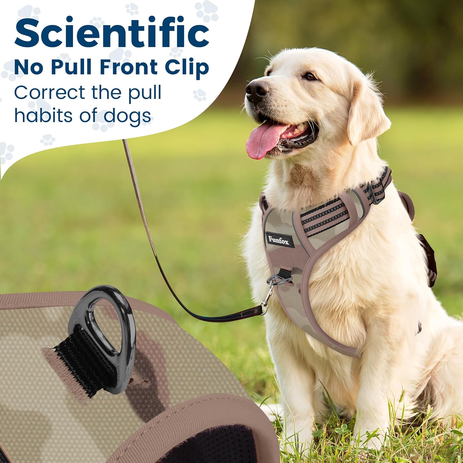 Funfox Dog Harness No Pull, Adjustable Pet Vest Harness, Super Soft Material with Vertical Handle Easy Control, Reflective Night Walking, 2 Leash Clips for Large Dogs, Camo Brown, L
