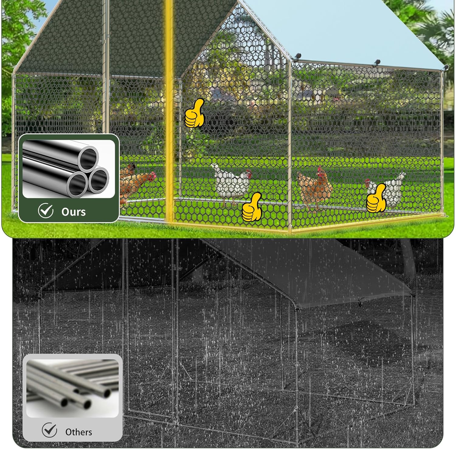 - 【Reinforced Steel Structure】: Not only is this chicken runs made from high quality galvanized steel, but we have also added 8 braces and a support bar around the cage to make your chicken coops strong and stable enough to withstand heavy winds and rain