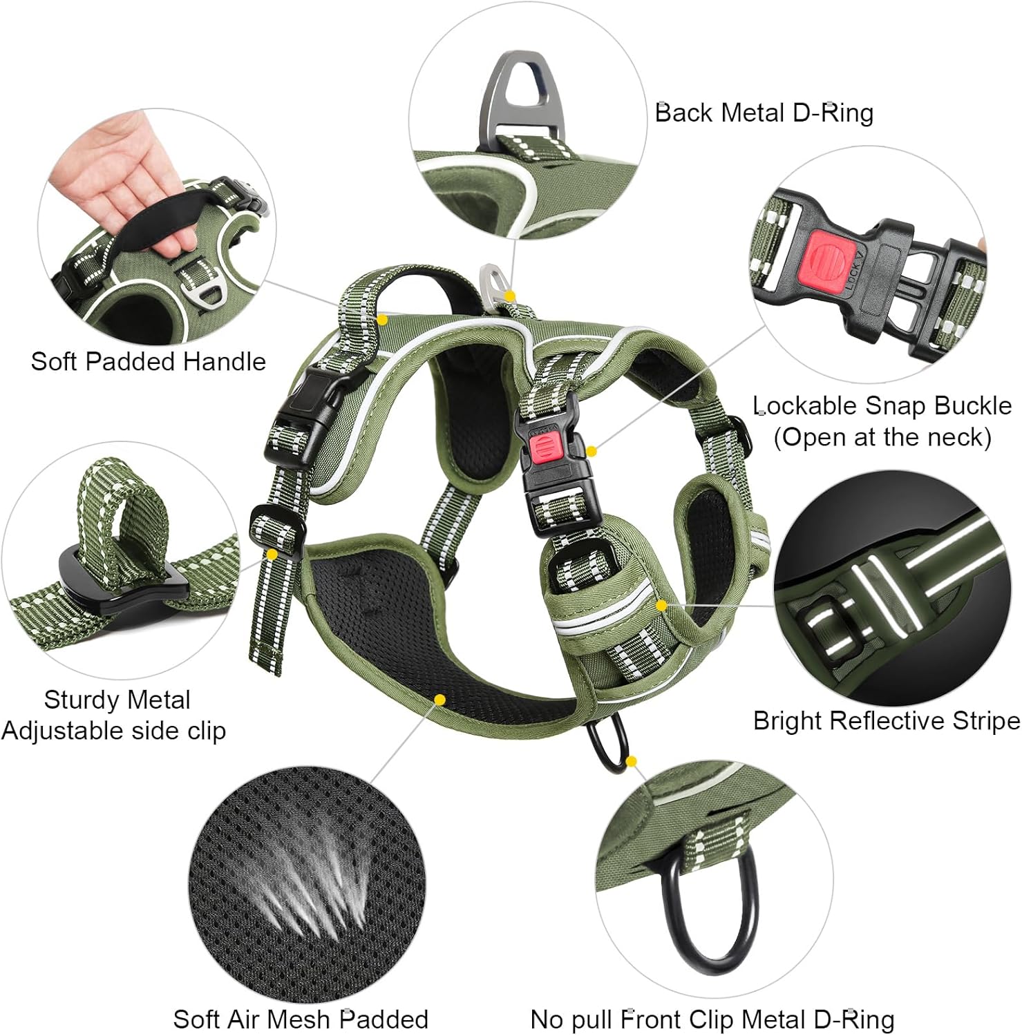Timos Dog Harness Small Sized, No Pull Pet Harness with Neck Lockable Snap,No Choke Front Clip Dog Reflective Vest,Adjustable Metal Rings 3 Buckles,Easy Control Handle for Small Dogs Green S