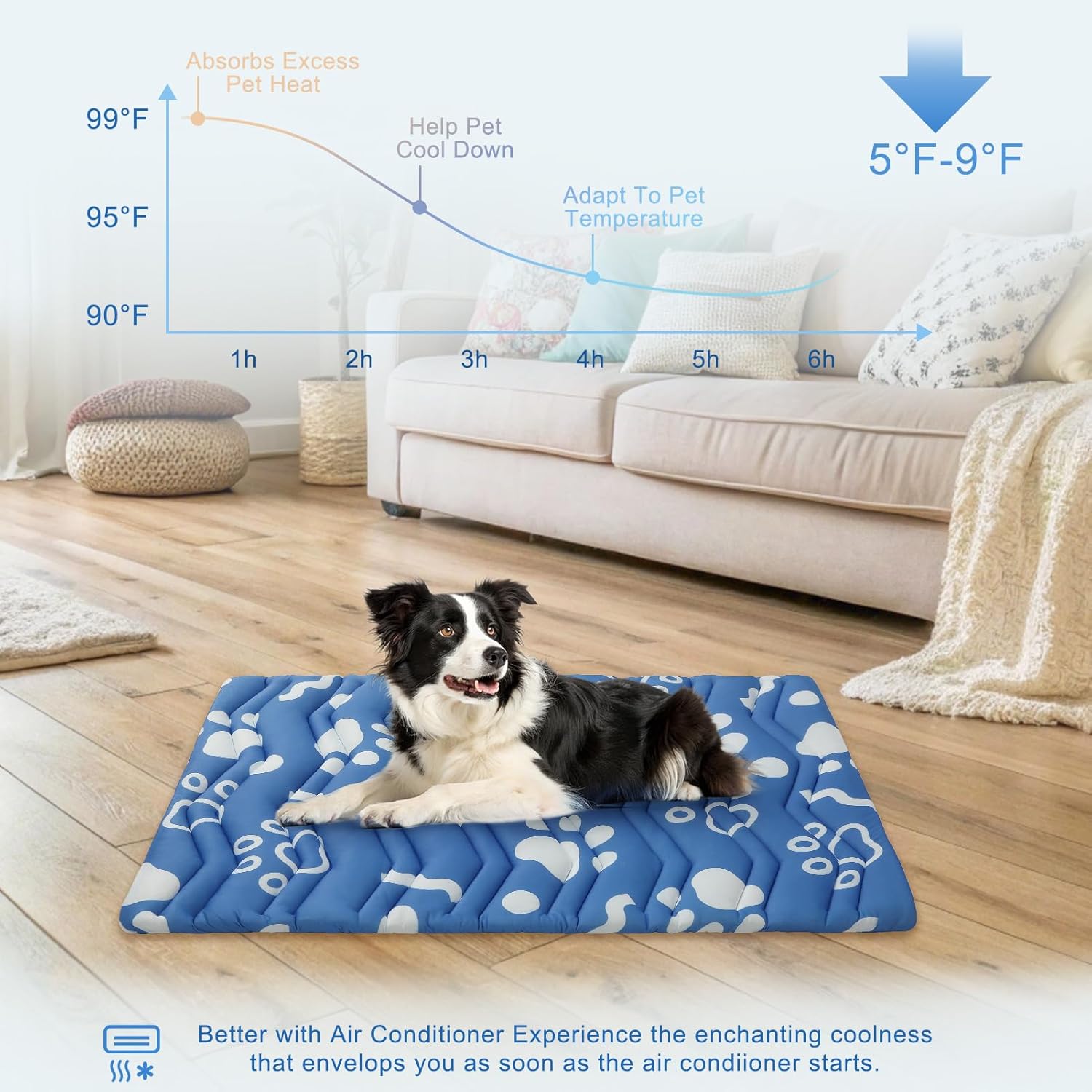 - Upgraded Self-Cooling Dog Mat: Engineered with premium cooling fabric, this mat delivers an instant 4–6°F temperature drop. No water, gel, or electricity required. Cooling mat for dogs is ideal for brachycephalic breeds (Bulldogs, Pugs) and heat-sensitive pets, it pairs seamlessly with AC/fans for amplified cooling, transforming patios, cars, or tile floors into instant chill zones