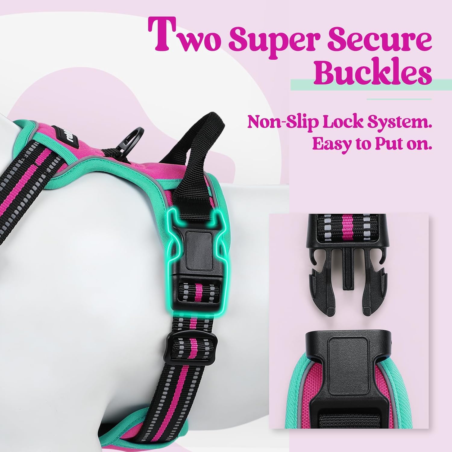 rabbitgoo Dog Harness No Pull with 2 Leash Clips, Adjustable Soft Padded, Reflective Oxford No Choke Pet Vest with Easy Control Handle for Large Dogs, Hot Pink & Turquoise, M