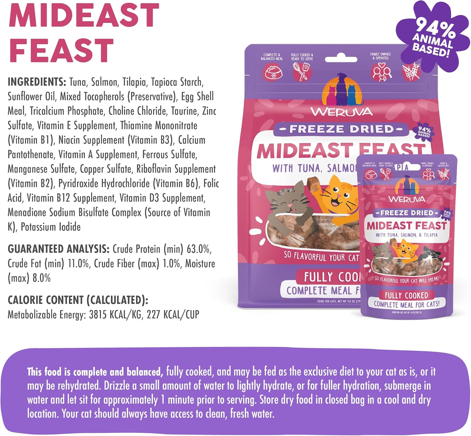 - Weruva Cat Freeze Dried Mideast Feast, 7oz Bag. Gently cooked tuna, tilapia, and salmon with sunflower oil. No bones or organs