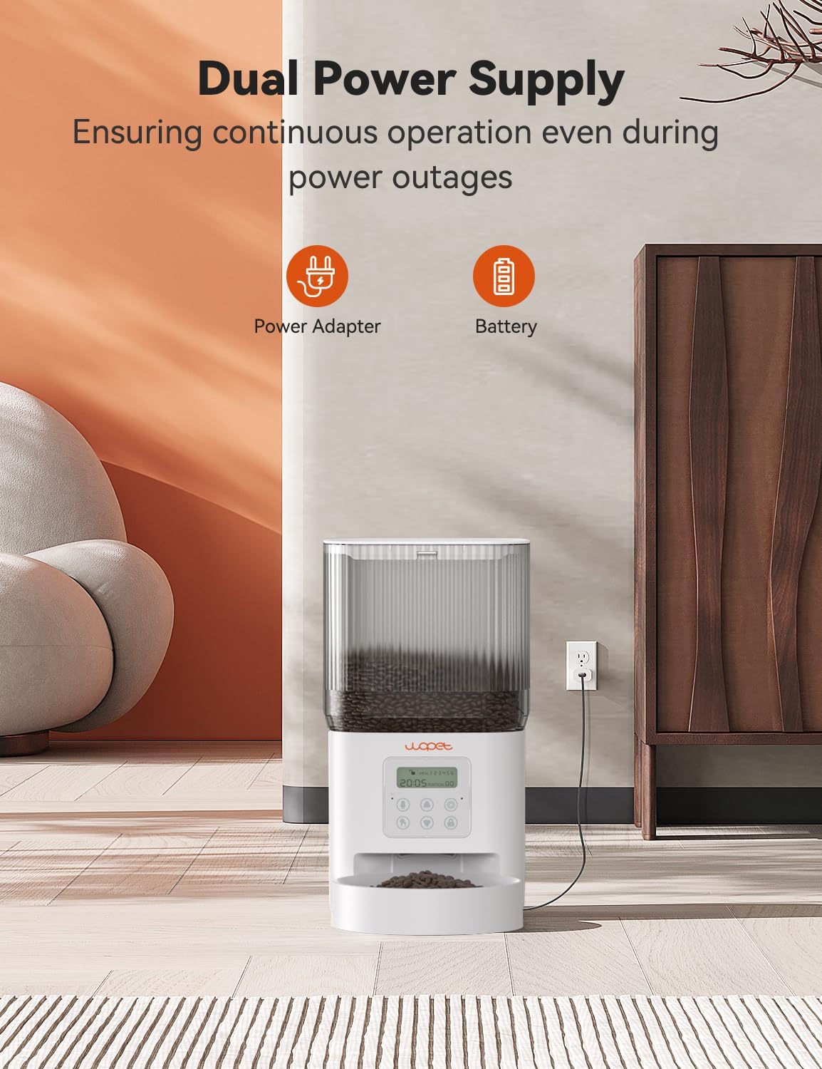 - Battery Power 180 Days Long Life:Automatic pet feeder supports Type-C socket power supply and battery power dual power supply operation, and preferred socket power supply (no loss of battery power), energy-saving (low power consumption); battery life of up to 180 days, when the socket power supply is disconnected, the feeder is automatically activated by the battery power supply.(batteries are not included)