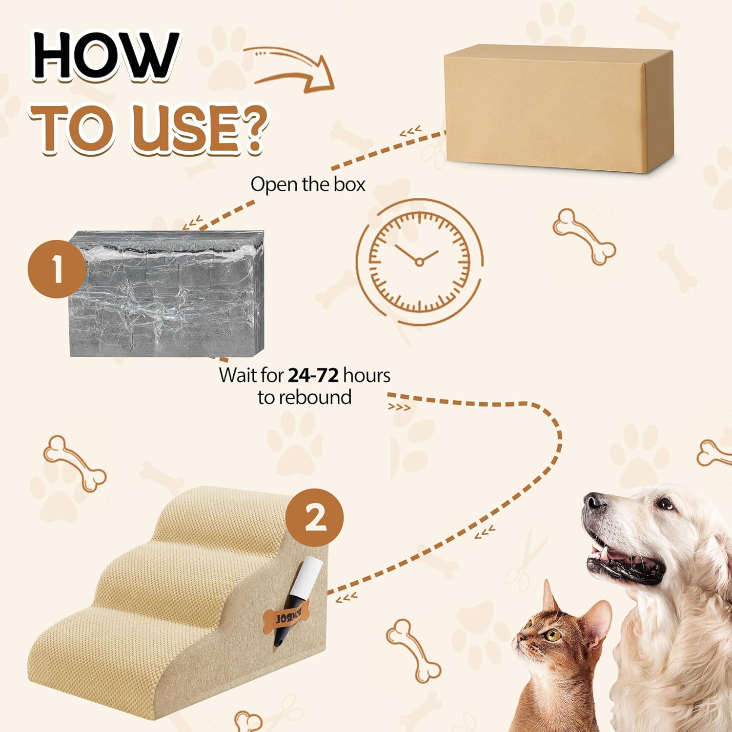 - VACUUM COMPRESSED for SHIPPING: allow 24-72 hours for full expansion (final dimensions may vary slightly whitin 2cm). Compression packaging may cause temporary fabric wrinkles - simply low-heat iron over cloth. It's a portable dog steps suitable for small and medium dogs