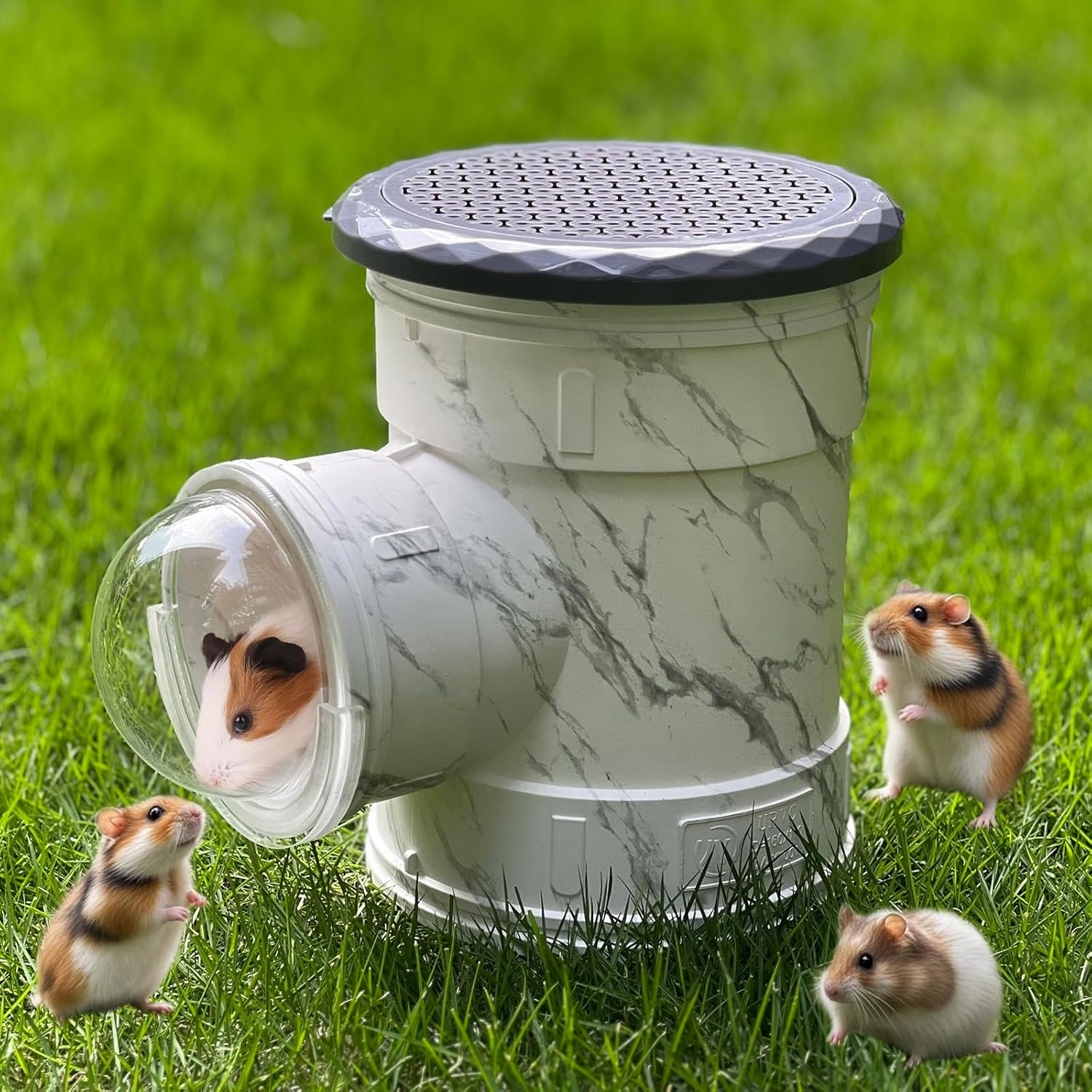 - DESIGN FEATURES: Transparent clear bubble dome mechanism with marble print design provides a clear front and top view also ventilation for optimal airflow and visibility, great handheld house cage for hamster, chinchillas and small guinea pig. Anti-bite and chewproof materials to keep your furry friends.