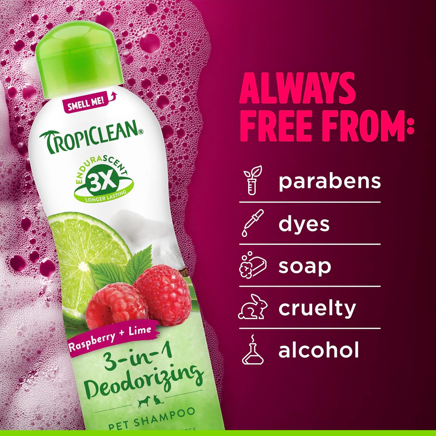 TropiClean Deodorizing Dog Shampoo, Powerful Odor Control, Long-Lasting Raspberry Lime Scent, Puppy Safe, Made in The USA, Cat Friendly, 20oz.