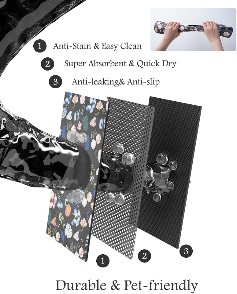 - Super Absorbent & Durable: Perfect pet supplies.This pet food mat can prevent liquid from overflowing. Super absorbent and quick-drying ability to avoid wetting pet paws even for messy drinkers. Sturdy dog & cat food bowl mat cannot be torn easily and avoid eating by mistake. Keep the pet's eating environment tidy and clean.