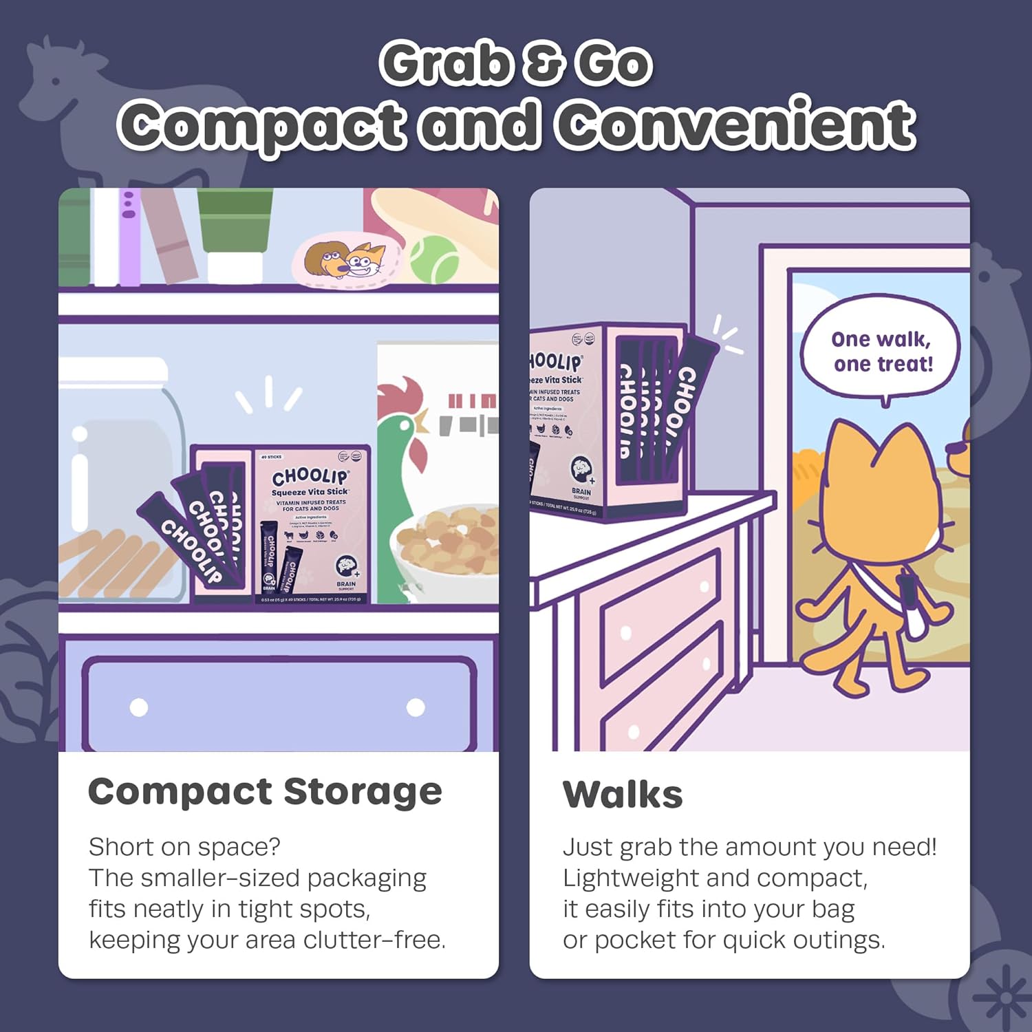 - COMPACT DISPENSER PACK: This Brain Support pack includes 49 sticks to treat your cat or dog. It’s perfect for quick, grab-and-go use, easy to carry in a bag for trips, or convenient to keep near your pet supplies.