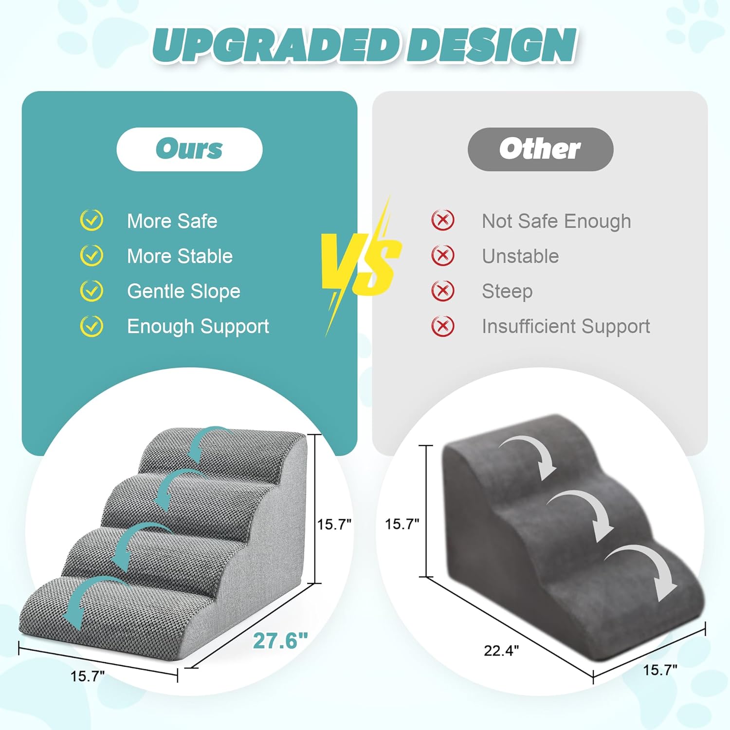 - STABLE AND STURDY: These dog steps for bed designed for small dogs and older cats are made of 30D high-density foam with an increased length and slope. These unique features create a more stable structure, providing the perfect balance of support and softness. In addition, the handle design of pet stairs can help you move it to any place where the dog needs to use it, greatly improving portability.