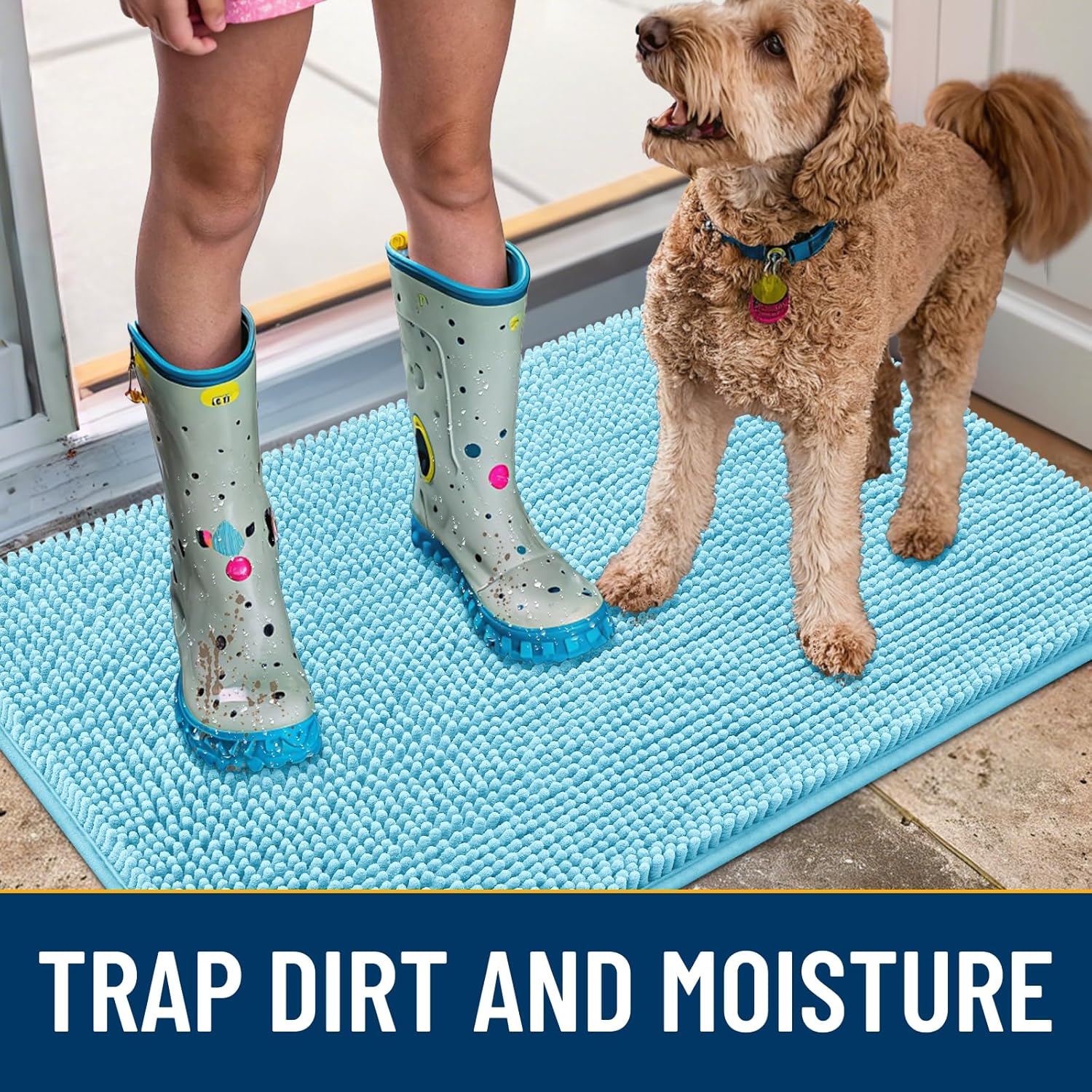 - [Absorbent and Dirt Trapper] High-density chenille dog mat, super absorbent and dirt-catching, whether wet after shower, muddy or moisture bring back by dogs, it can absorb well, so that you and your favorite pet can say goodbye to the wet and mud. It's an excellent choice for use as an entryway door mat, a welcome door mat or a dirt-trapping door mat.