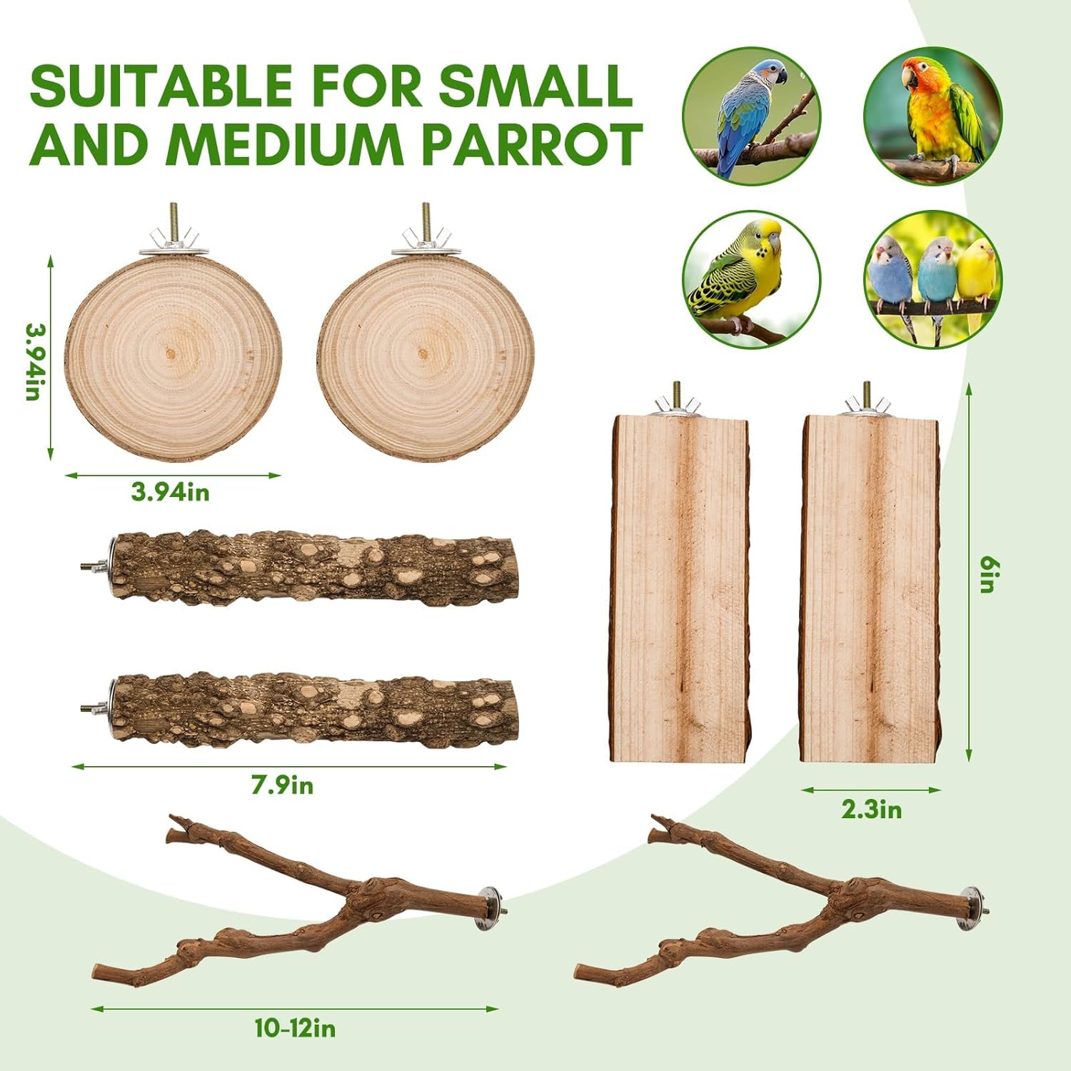 - Four Types of Parrot Perches: The EELLAO 8pcs bird perch set includes 2 grapevine claw-grinding perches, 2 long-tail parakeet perches, 2 round platforms, and 2 square platforms to accommodate various types of parrots you keep.