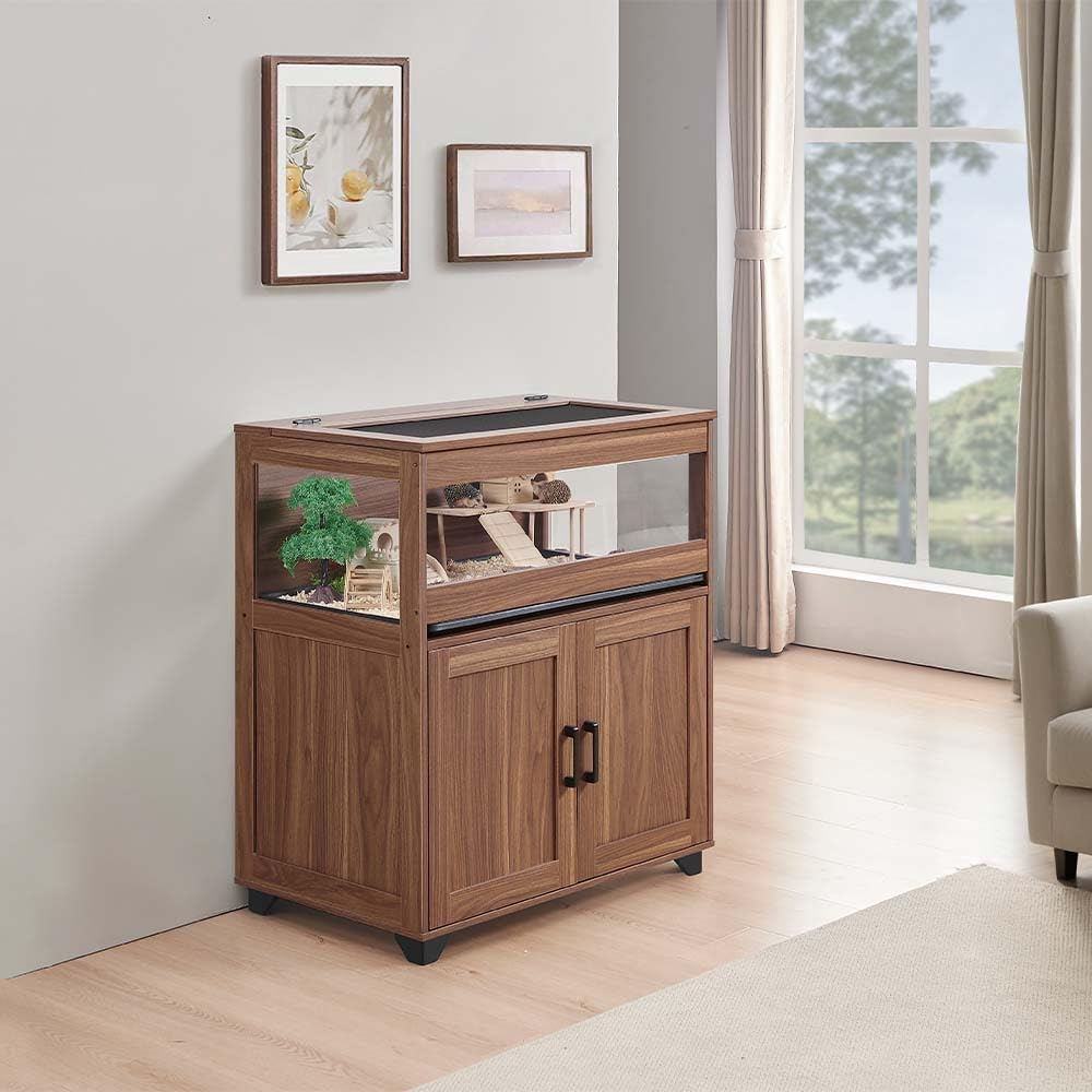 unipaws Hedgehog Cage with Storage Cabinet, Hamster Cage for Rat and Guinea Pigs, Clear Transparent PVC Visual Small Animal Cage with Tray, Hamster Enclosure, Walnut