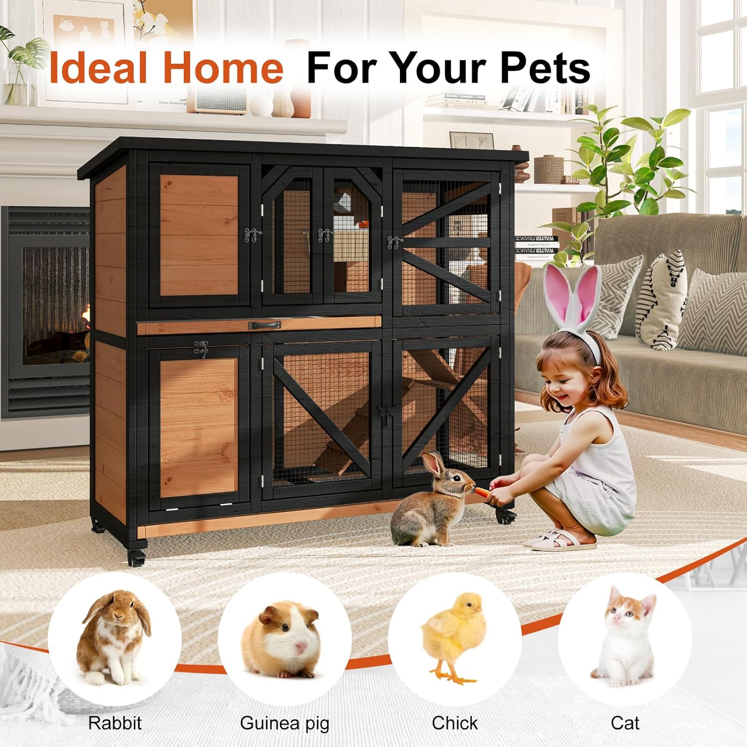 - Movable for Indoors & Outdoors: 47.3" rabbit cage with 4 smooth-rolling wheels, 2 of which are lockable. Can be moved indoors or outdoors. Easily move the cage between rooms, patios or gardens, keeping it safe on any surface.