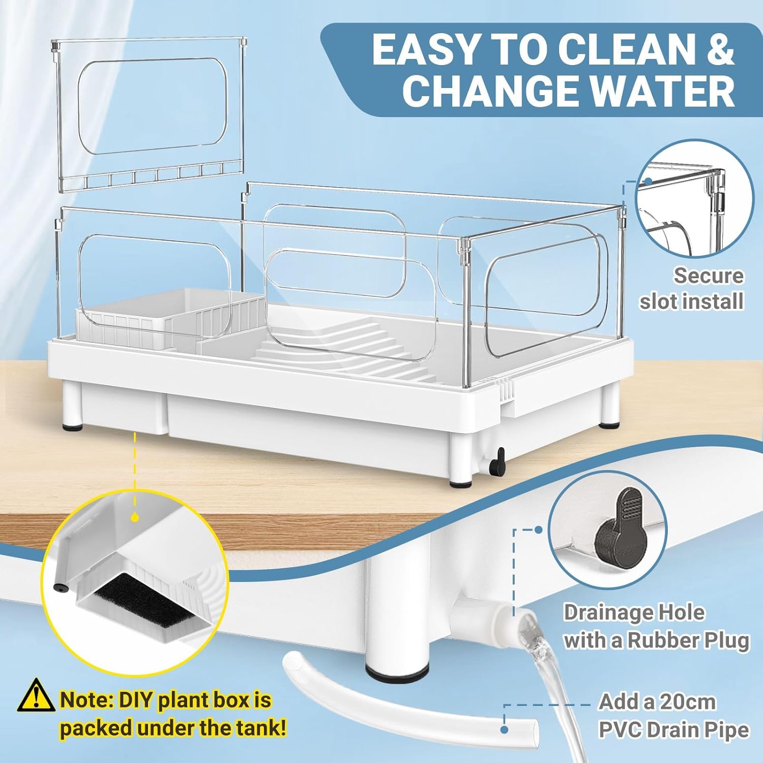 - 【EASY TO USE AND CLEAN】Keep your turtle tank clean and hassle-free with bottom drainage feature. Simply drain the water, remove debris, and refill for a healthier habitat. There is a DIY plant box is packed under the tank, you can use our included colored stones and trees to decor the landscape of the turtle aquarium.