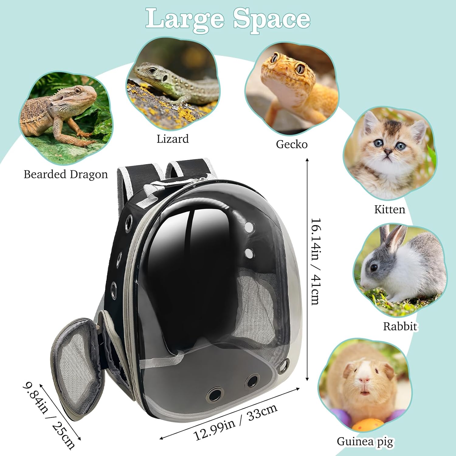 - Spacious Internal Space: The bearded dragon travel carrier measures 12.99"L x 9.84"W x 16.14"H (33 x 25 x 41cm), providing ample space for your bearded dragon to move around. This design is not only suitable for bearded dragons, lizards, and geckos, but also for small animals such as rabbits, hamsters, and kittens. The spacious interior ensures your pet won't feel cramped, making travel more comfortable and enjoyable for them