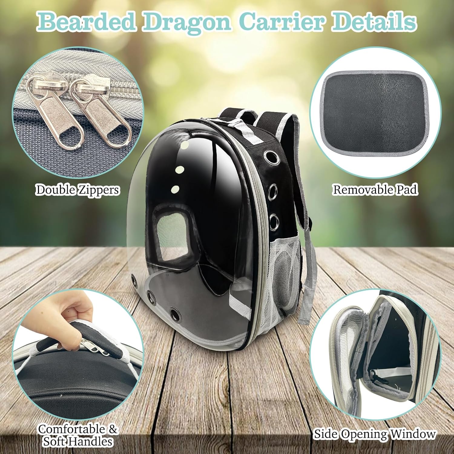 - Transparent Bubble Window: The bearded dragon backpack features a transparent bubble window design, allowing you to observe your pet's movements while also enabling your pet to see the outside world, satisfying its curiosity and reducing anxiety. The front hard clear bubble window provides better protection for reptiles in case of accidents, avoiding them from being crushed or attacked