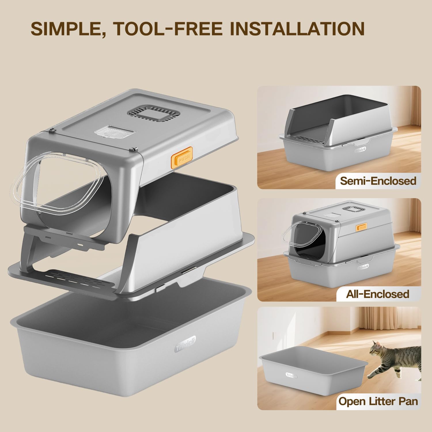 - Dual Mode – Semi-Enclosed or Fully-Enclosed Flexibility Customize your cat’s privacy by using the litter box as either a semi-open or fully enclosed system. The upper lid features ventilation holes to improve airflow and reduce moisture buildup.