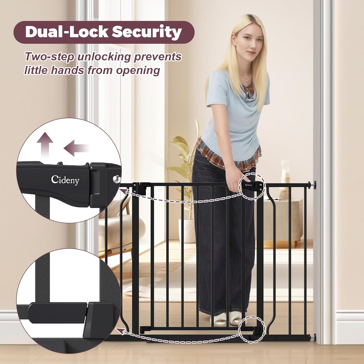 - Dual-Lock Safety: This pet gate for doorways no drilling features a secure dual-lock mechanism, ensuring curious children and pets stay safely contained while allowing adults to open it effortlessly with one hand. Parents can pass through with ease even while carrying groceries or a baby.
