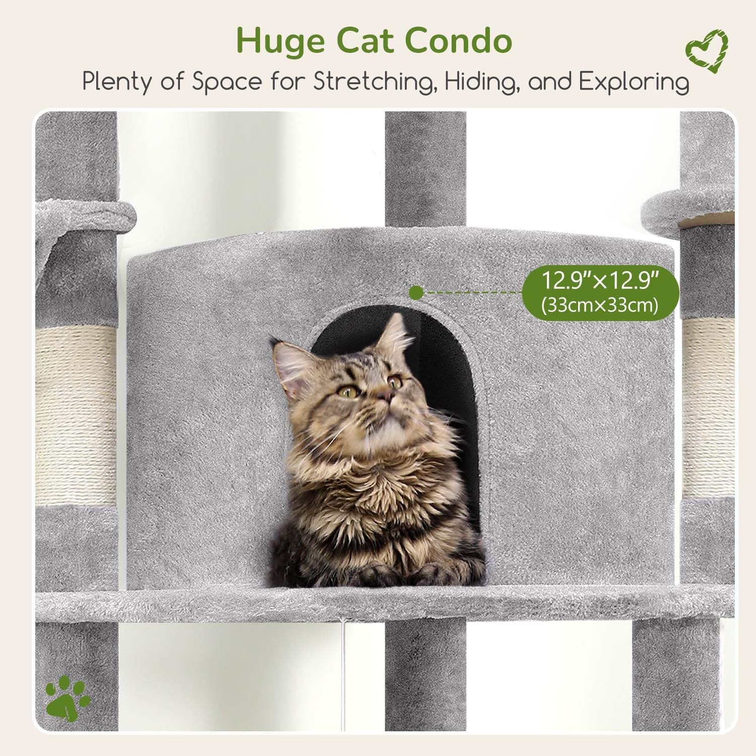 - Natural Sisal Posts: This sturdy cat tree condo tower is fitted with 7 robust scratching posts wrapped in natural sisal, ideal for meeting your indoor cat’s scratching needs and protecting your furniture from wear. These durable posts support healthy paw maintenance and encourage natural climbing and exploration behaviors