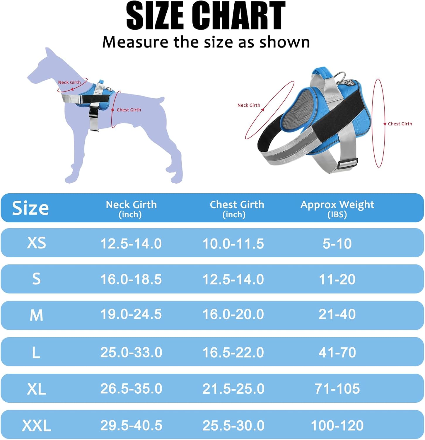 - EXTRA SMALL DOG HARNESS: ★Approx Weight: 5-10 lbs. Neck Girth: 10"-11.5", Chest Girth: 12.5"-20"★. It perfect for extra small dogs and pups, like Yorkie, Chihuahua, Pug, Maltese dog, etc.