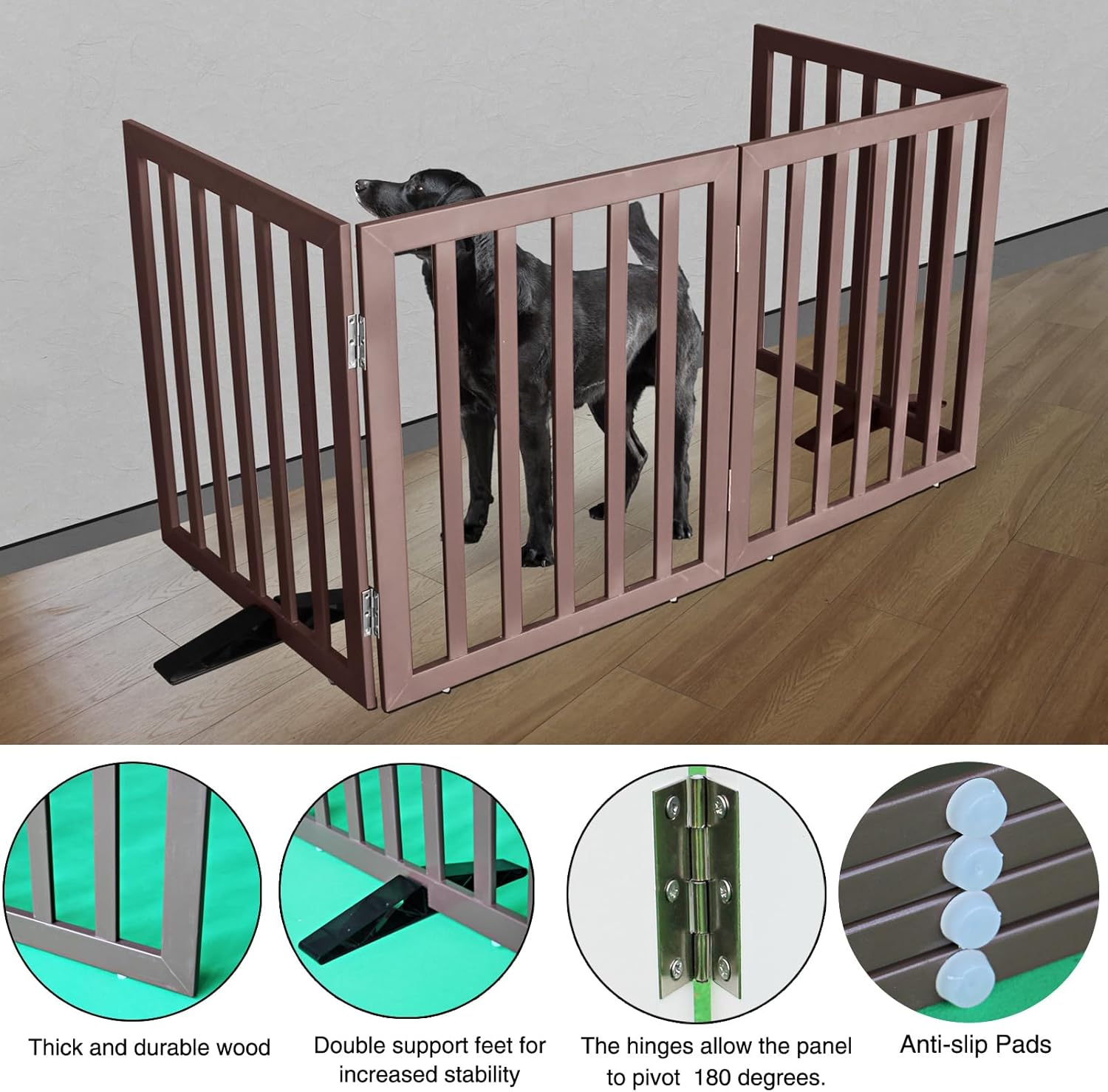 ZJSF Freestanding Indoor Dog Gate for House Foldable Wood Puppy Gate for Doorways Pet Gate for Stairs Extra Wide Pet Fence, Brown, 32" Height 4 Panels