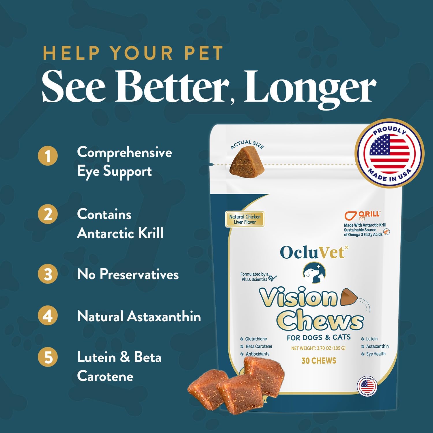Vision Chews Eye Supplements for Dogs & Cats, Natural Chicken Flavor, Contains Omega 3, Lutein, Antioxidants, & More, Cat & Dog Eye Supplements, No Preservatives, Made in USA, 1 Bag, 30 Chews
