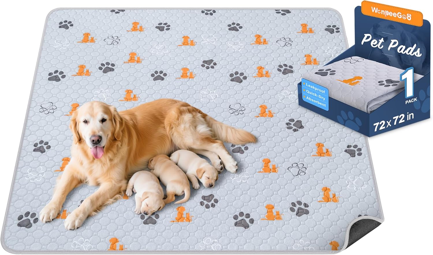 Washable Pee Pads for Dogs, 1 Pack Absorbent Reusable Training Dog Pads Pet Puppy Pads, Non-Slip Potty Pads for Whelping, Playpen, Crate, Bed, Orange, 72"x72"