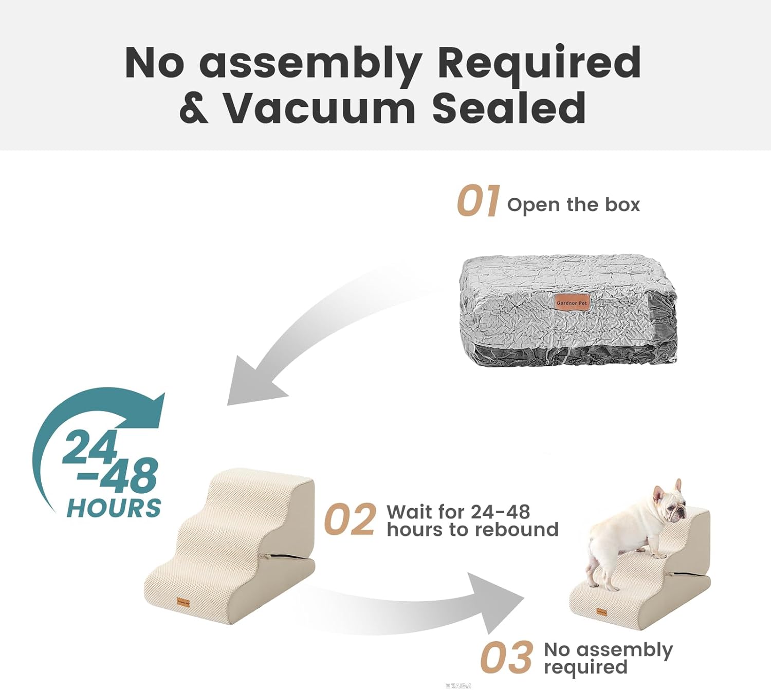 - No Assembly Required: The foam dog stairs for bed is convenient and hassle-free, simply unbox the pet steps, your furry friend can start using it right away. Due to vacuum compression, the surface of the puppy stairs may appear slightly wrinkled, and it will recover within 24-48 hours.