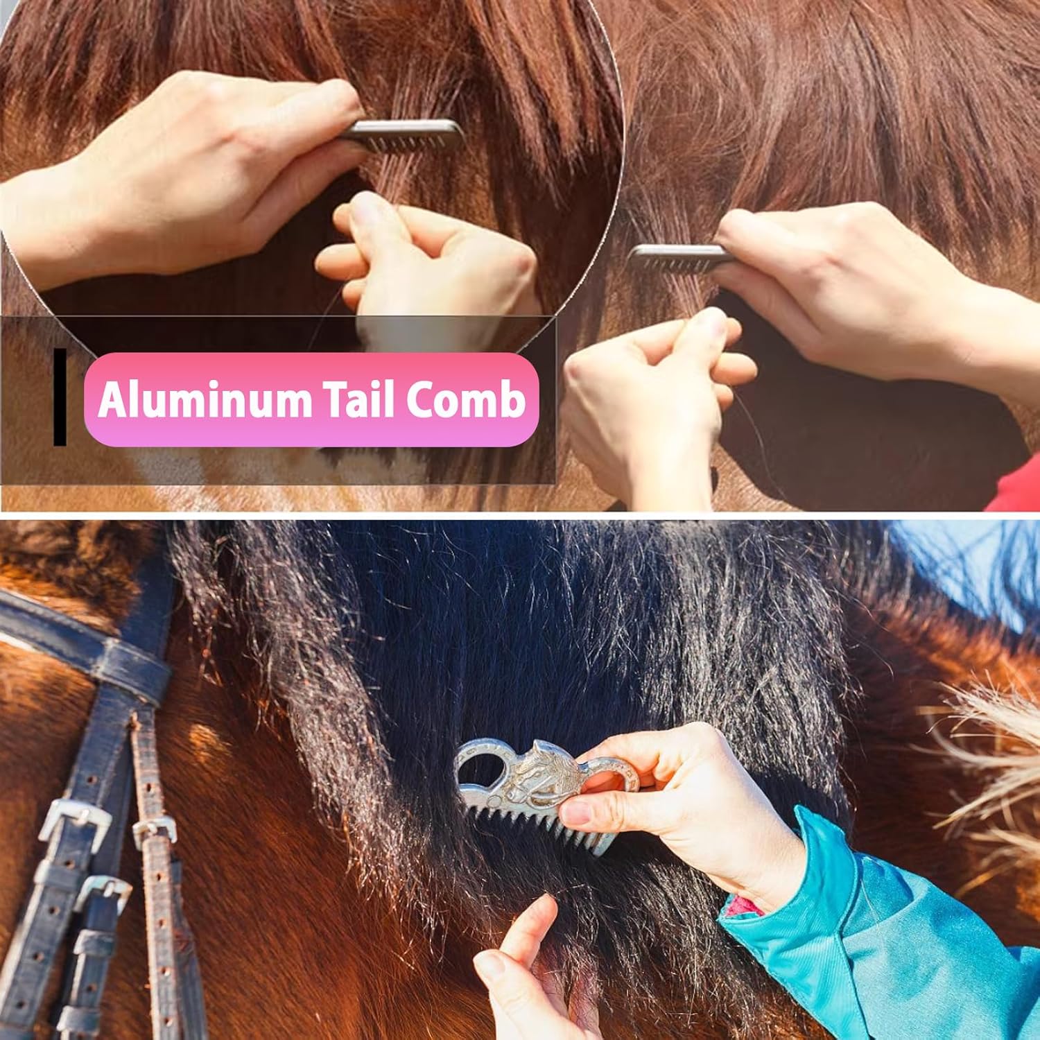 - Horse Grooming Kit 13-piece Includes: 1x soft horse brush, 1x hard horse brush, 1x grooming sponge, 1x oval massage curry, 1x hoof pick with brush, 1x sweat scraper, 1x curry comb, 2x portable metal comb, 1x mane and tail brush,1x horse braiding comb, 1x rubber band, 1x storage tote bag