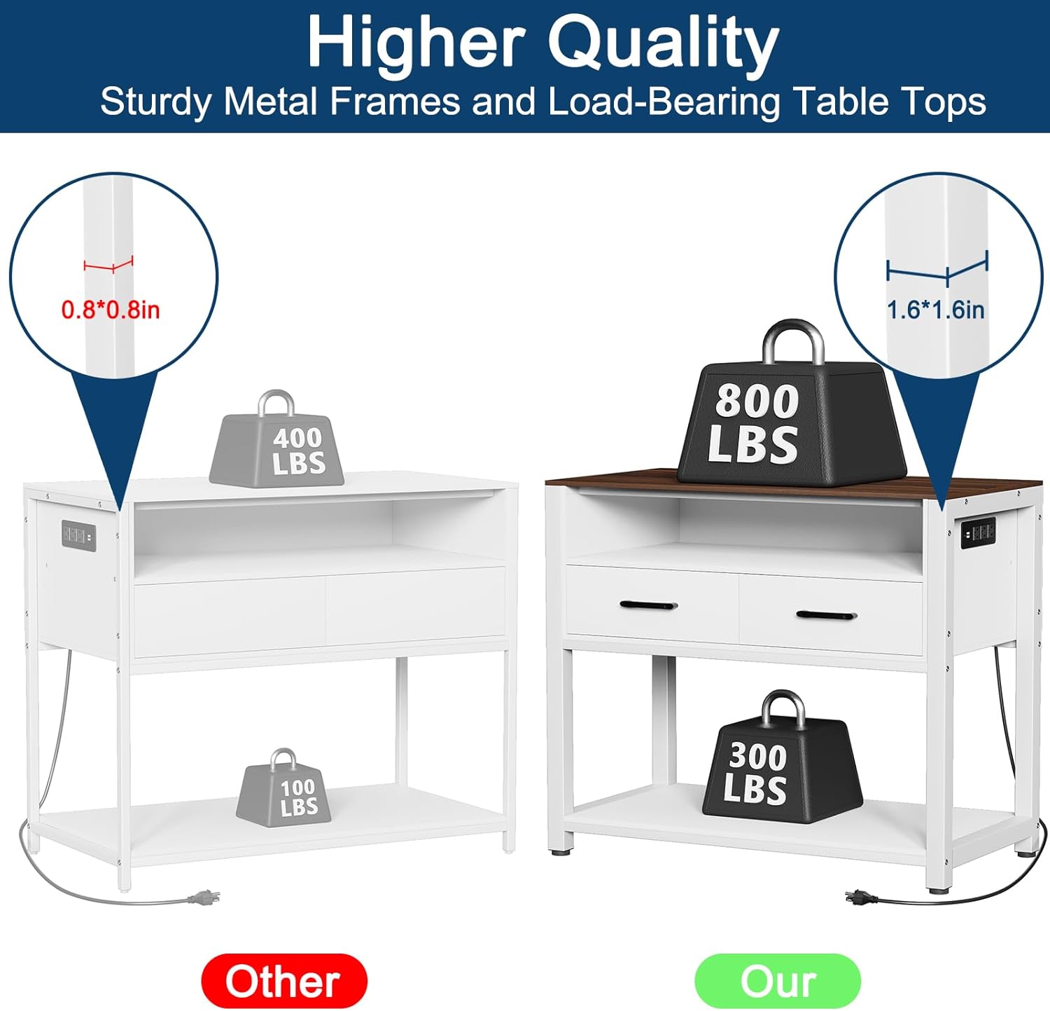 40-50 Gallon Fish Tank Stand with Power Outlet & 2 Storage Drawers, Heavy Duty Metal Frame Aquarium Stand with Waterproof Mat, 36.6" L*19.1" W Tabletop, 800LBS Capacity, White+Brown