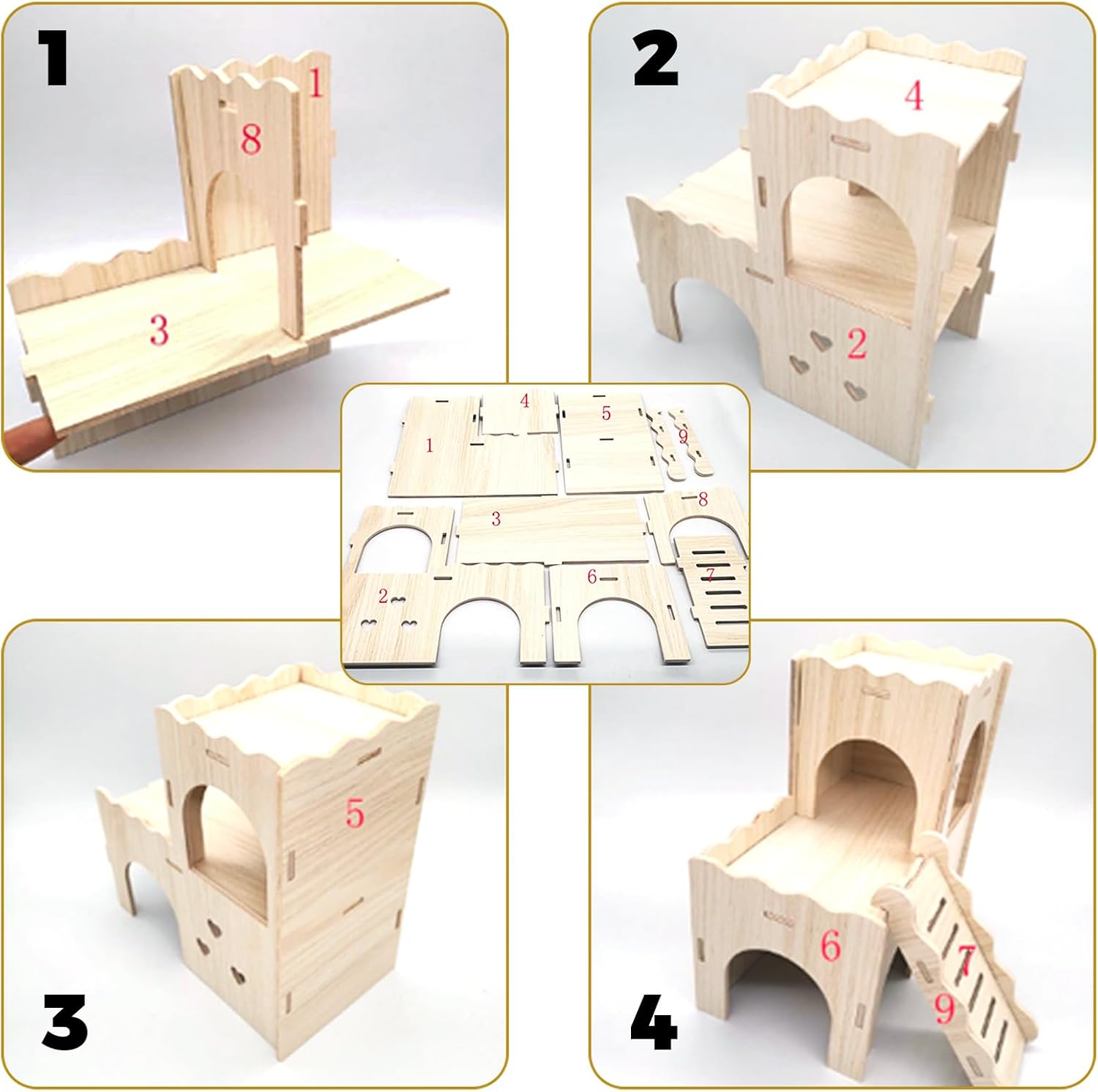 - Wooden Hamster Castle: The hamster hideaway features a double-layer structure design and 2 independent hamster hides. It also allows you to flexibly adjust the layout according to personal preferences or pet need, increasing the diversity and enrichment.This gerbil house is made of natural wood and has no peculiar smell. Every corner is polished smoothly to avoid scratching pets. It brings a chew able and safe hamster hut for syrian hamsters.