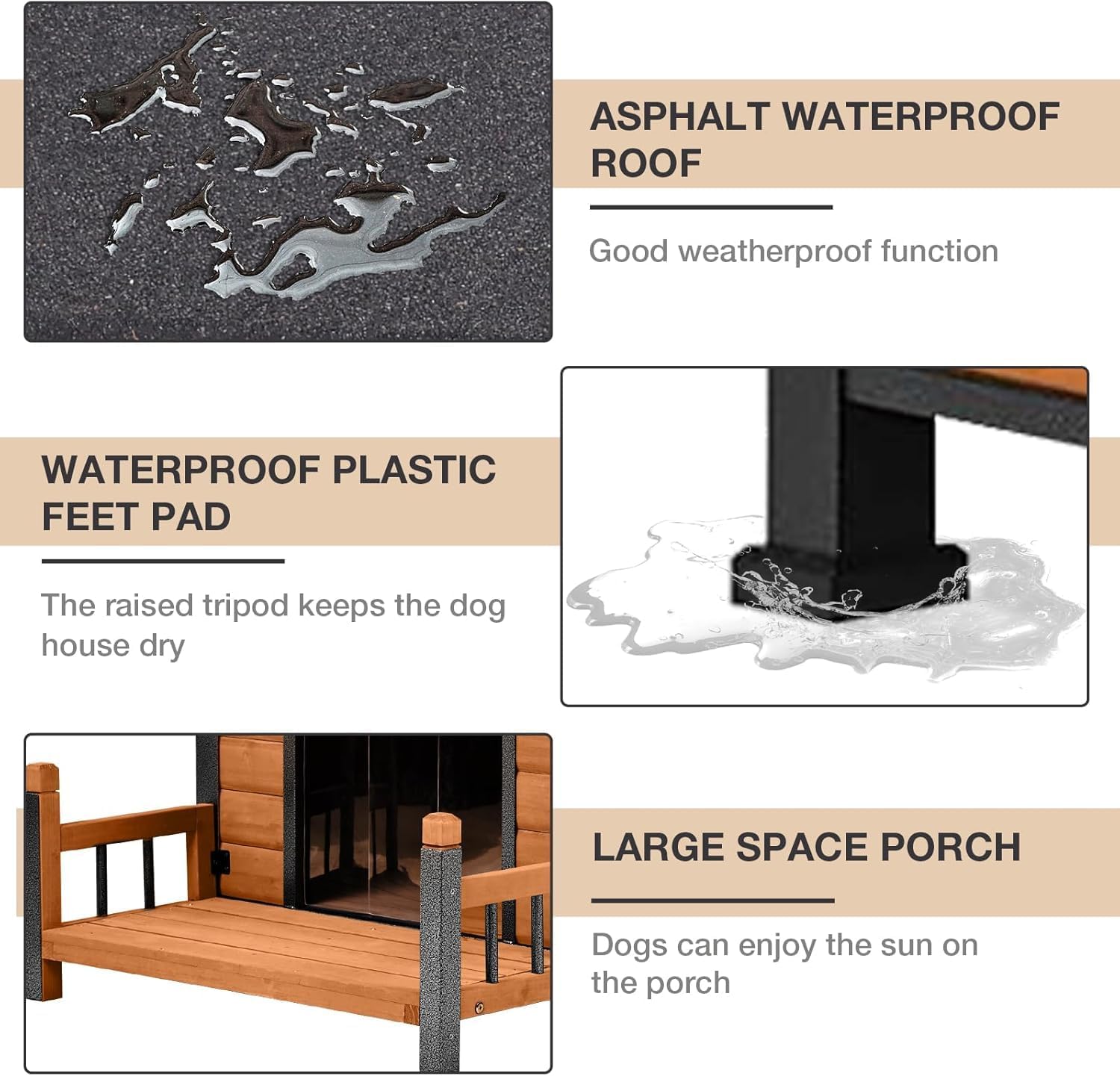 - WEATHERPROOF DESIGN FOR SAFETY: Equipped with an asphalt roof and water-resistant Plastic Feet Pad, our Dog House offers a raised floor for ultimate weatherproofing.Keep your pet stays dry and protected. It's a ideal choice for any outdoor space