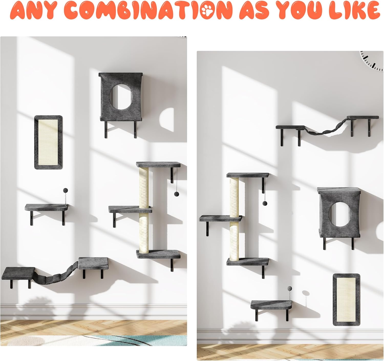 - ONE-STOP PLAYGROUND - This wall mounted cat climber includes cat house, bridge, scratching post, hammock, wall shelves, it will allow your cat to explore, climb and play to their natural ability.