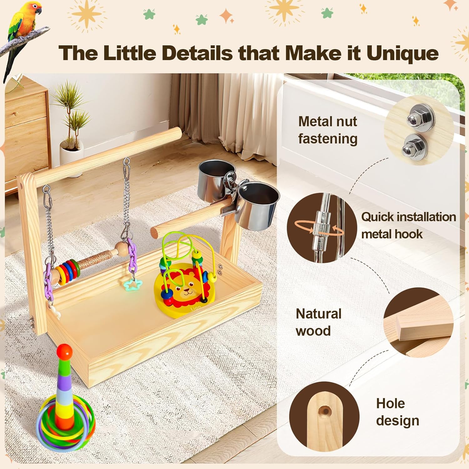 Mini Wood Bird Playground Birds Perch Stand Desktop Parrot Play Stand Parrot Tree with Feeder Cups Hanging Swing Toys and Foraging Toys Parakeet Play Gym for Budgie Cockatiel Conure Lovebird