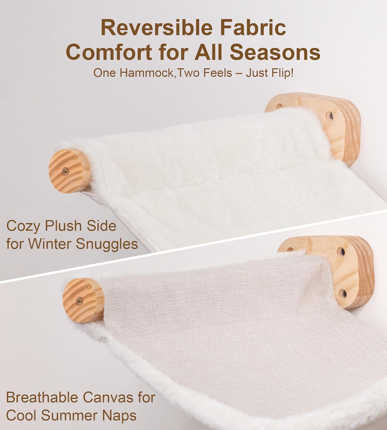 - Reversible & All-Season Cat Hammock: Dual-Sided Fabric for Year-Round Comfort; Our wall-mounted cat hammock features a reversible bed surface: breathable cotton canvas for spring and summer, and cozy plush fabric for fall and winter; Whether your cat loves to stay cool or snuggle up, this cat wall hammock delivers comfort in every season; Plus, the double-stitched edges ensure long-lasting durability.