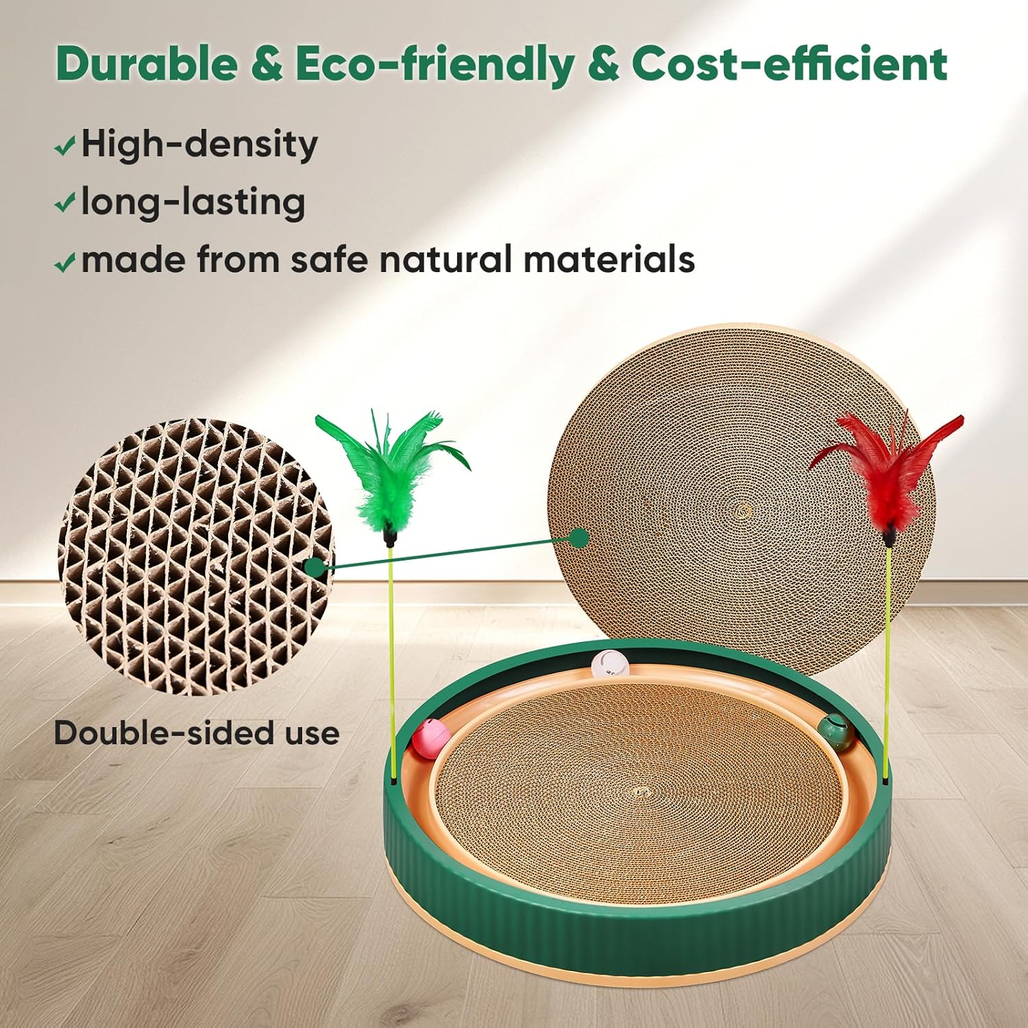 20-Inch Round Cat Scratcher with Ball Track – 3-in-1 Cardboard Scratching Pad with Feather Toy & Non-Slip Base – Interactive Cat Toy for Indoor Cats, Kittens & Large Cats (Green)