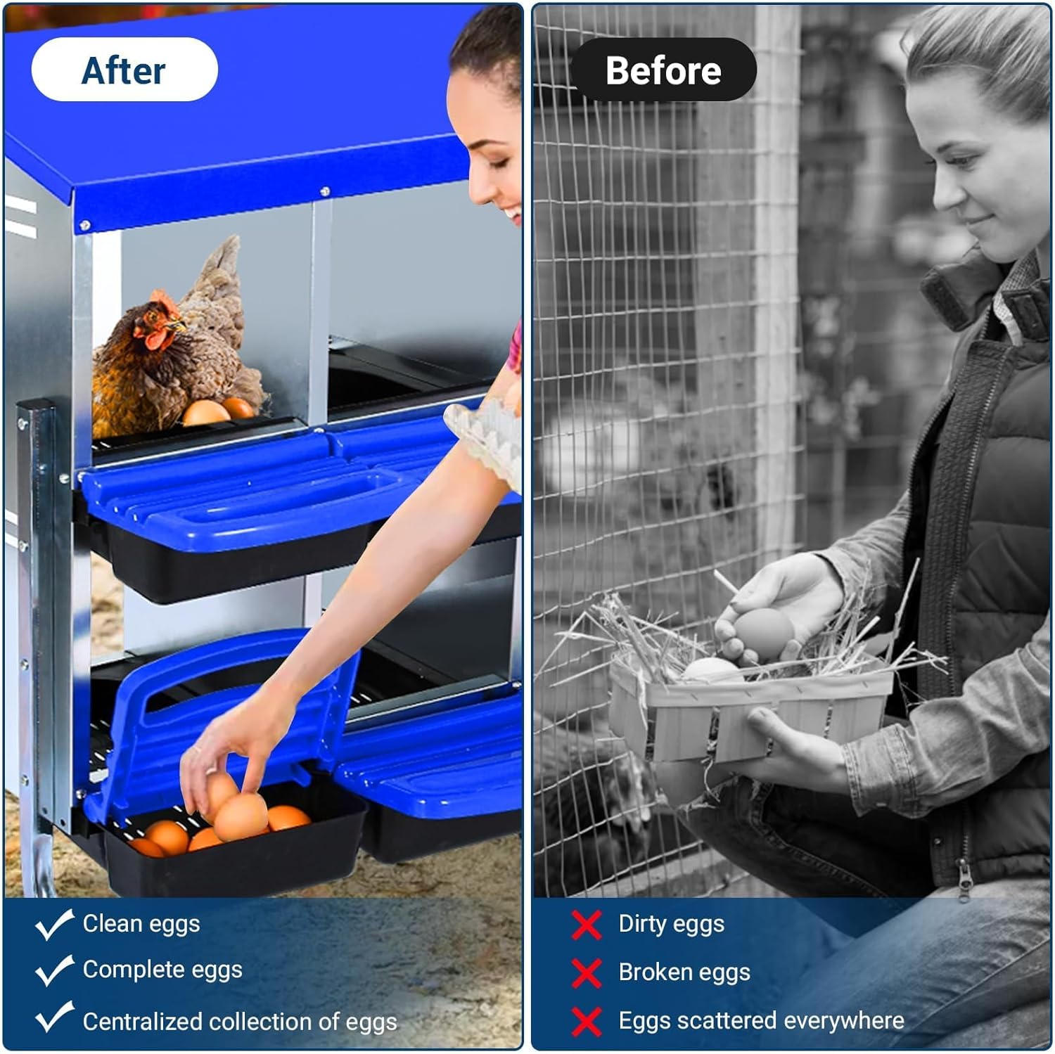 - 【Efficient Egg Collection】--The unique inclined design of the nesting box ensures the eggs roll smoothly into the collection tray for easy retrieval, without reaching into the nesting area, ensuring they remain clean and intact.