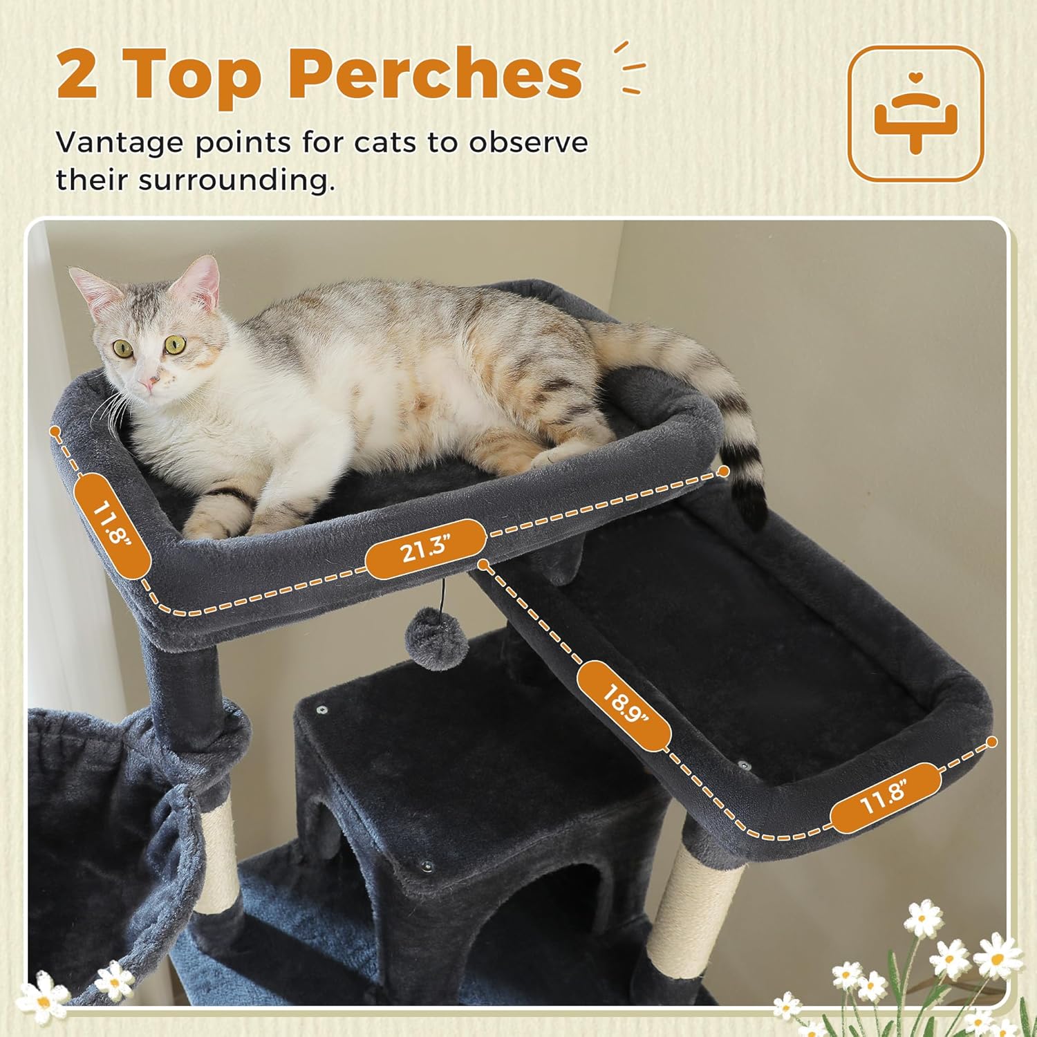 - 2 Large Top Perches: This adult cat tower with scratching post features 2 large top perches, perfect for Maine Coon and large adult cats up to 20lbs. The multi-level design offers climbing space for indoor cats in multi-cat households.