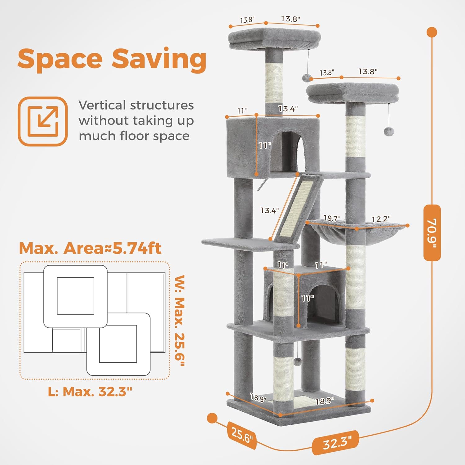 PAWZ Road 70 Inch Cat Tower, Tall Cat Tree with 2 Cozy Condos, 2 Plush Perch, Large Basket, 2 Scraching Pad & 6 Scraching Posts for Indoor Cats Large Adult, Gray