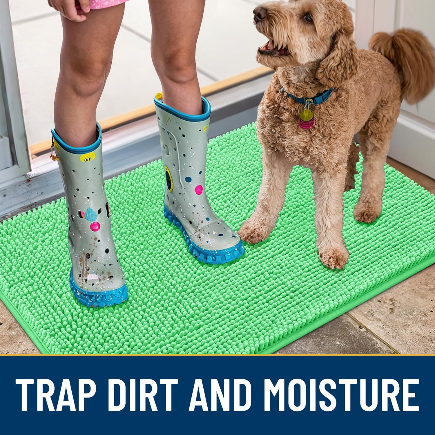 - [Absorbent and Dirt Trapper] High-density chenille dog mat, super absorbent and dirt-catching, whether wet after shower, muddy or moisture bring back by dogs, it can absorb well, so that you and your favorite pet can say goodbye to the wet and mud. It's an excellent choice for use as an entryway door mat, a welcome door mat or a dirt-trapping door mat.