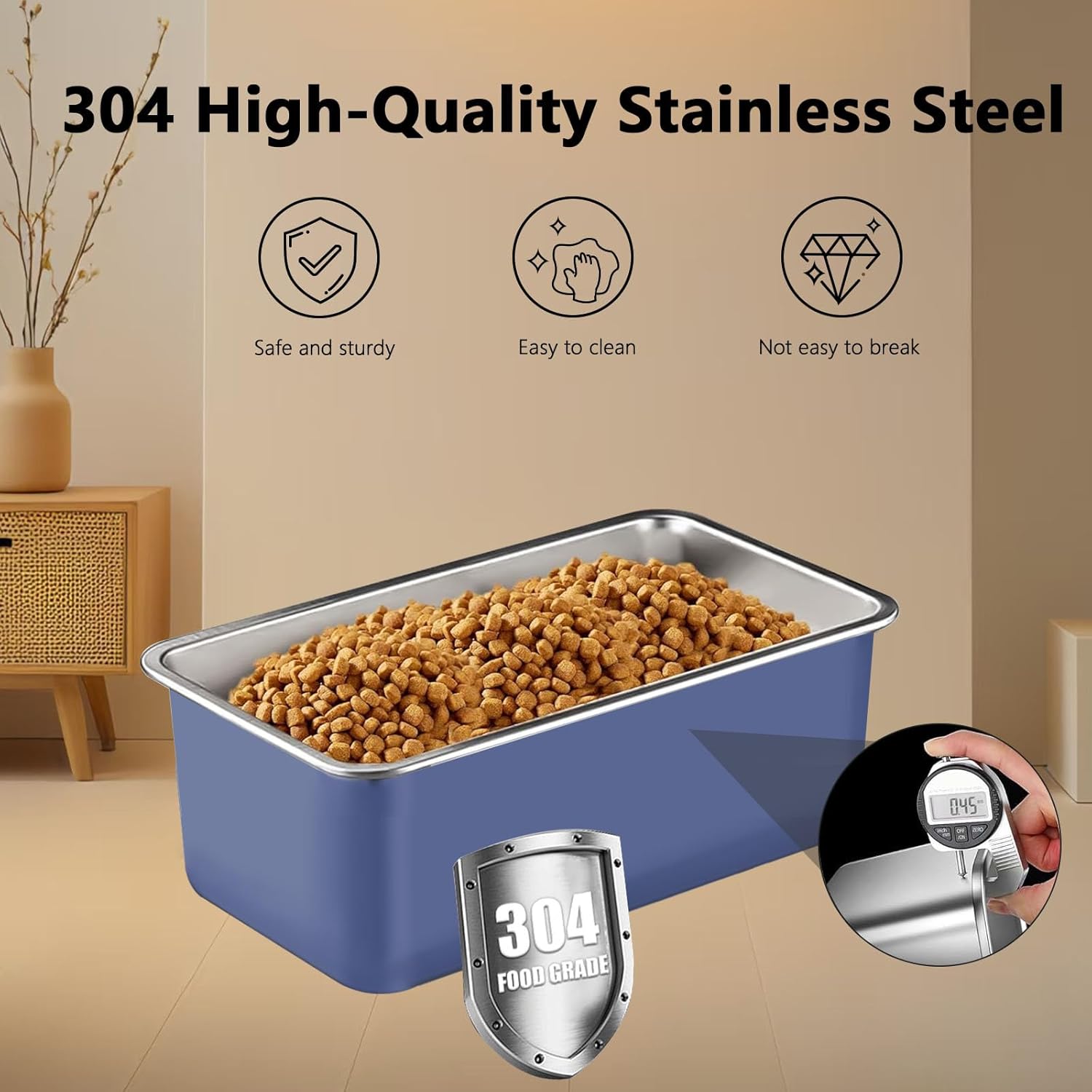 - 304 Stainless Steel Materials: Our dog food storage containers are made of 304 stainless steel, which is more durable and drop-resistant than ordinary plastic food storage buckets. Come with a stainless steel scoop is more durable than the plastic scoop, not easy to damage, and can be used for a long time.Can maximize the freshness of dry food and snacks, the stainless steel surface is not easy to adhere to food debris, providing you with a clean and orderly food storage area