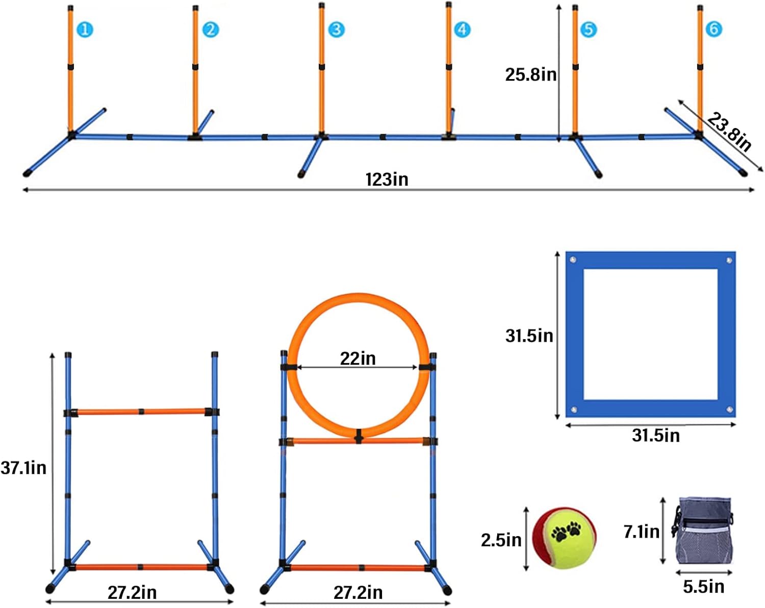 - THE IDEAL GIFT PACKAGE: This doggie agility set makes an exceptional gift for both young and seasoned dog lovers. It includes a square pause box, an adjustable dog agility jump hurdle with pole connectors, a tire jump, weave poles, agility equipment carrying bags, and an instruction sheet for your convenience.