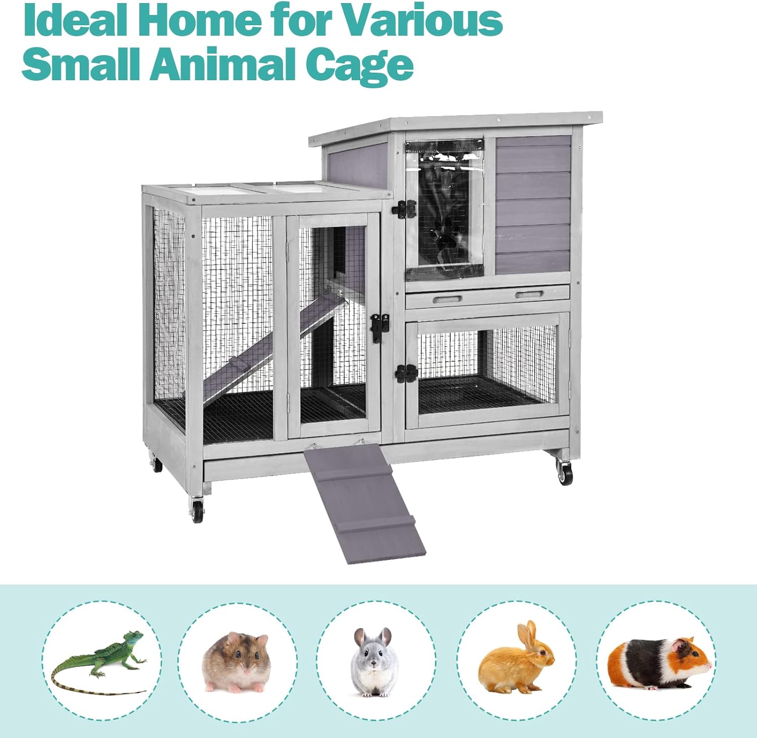 Rabbit Hutch Indoor for 2-4 Rabbits & Guinea Pigs,Bunny Cage with Slide-Out Plastic Trays,Wooden Small Animal Cage for Rabbits, Bunnies, and Guinea Pigs (Light Grey)
