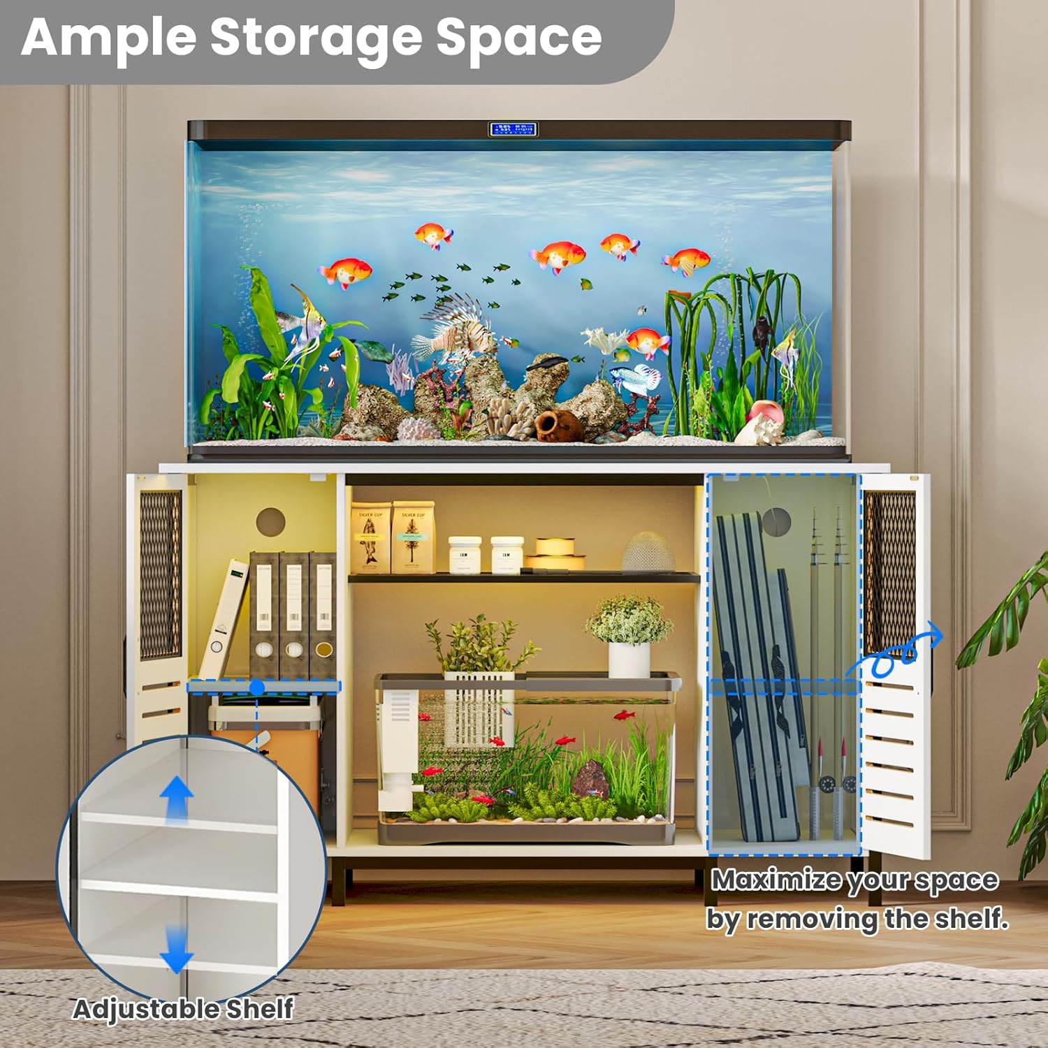 EAG 55-75 Gallon Fish Tank Stand with Power Outlets & LED Light, Heavy Duty Aquarium Stand with Adjustable Shelves, Turtle Reptile Terrarium Tank Stand with Cabinet, 1250LBS Capacity, White